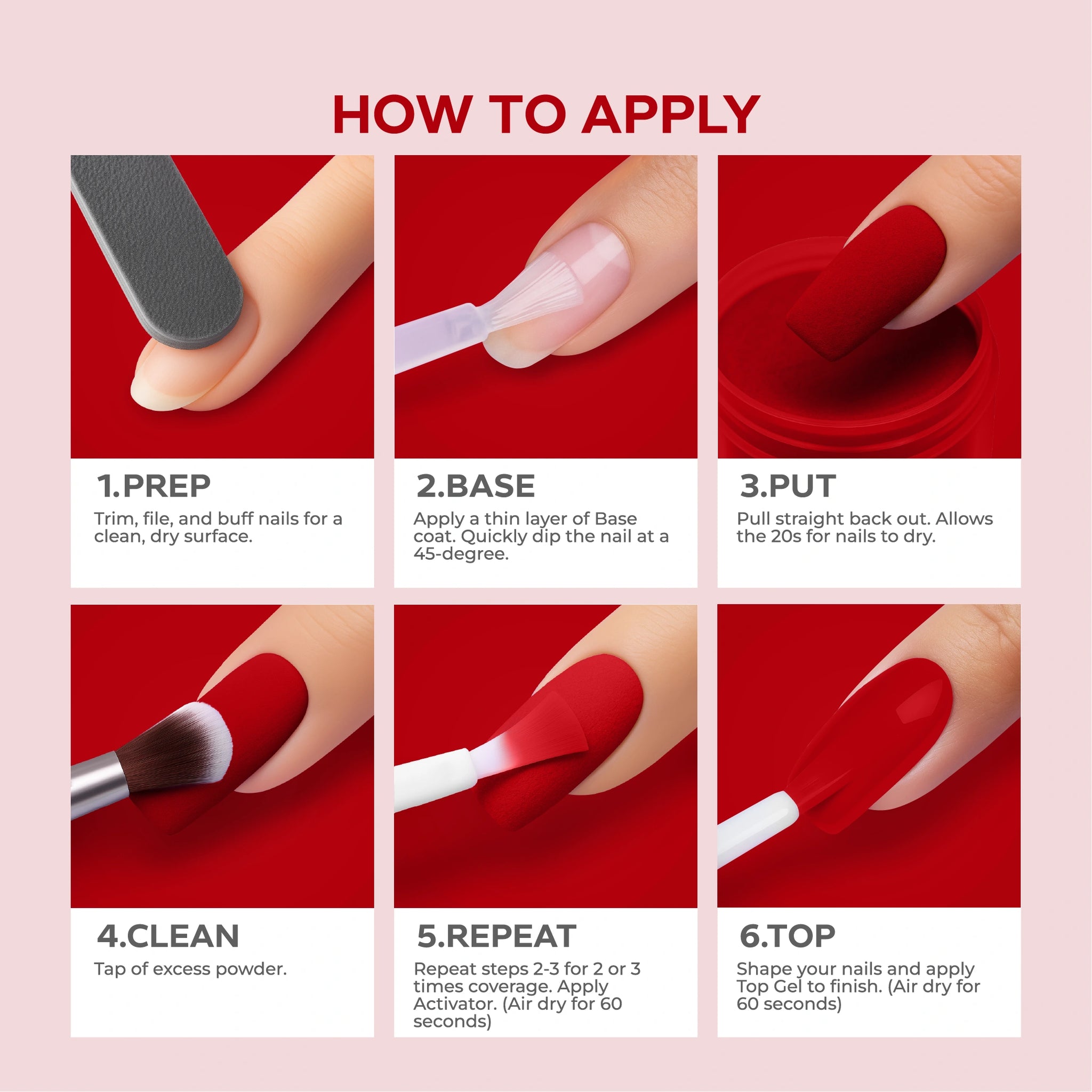- أضيفي البودرة: اغمسي أظافرك فورًا في بودرة Nano® Dip Powder أو رشي البودرة بالتساوي على الأظافر. قومي بإزالة أي بودرة زائدة برفق.