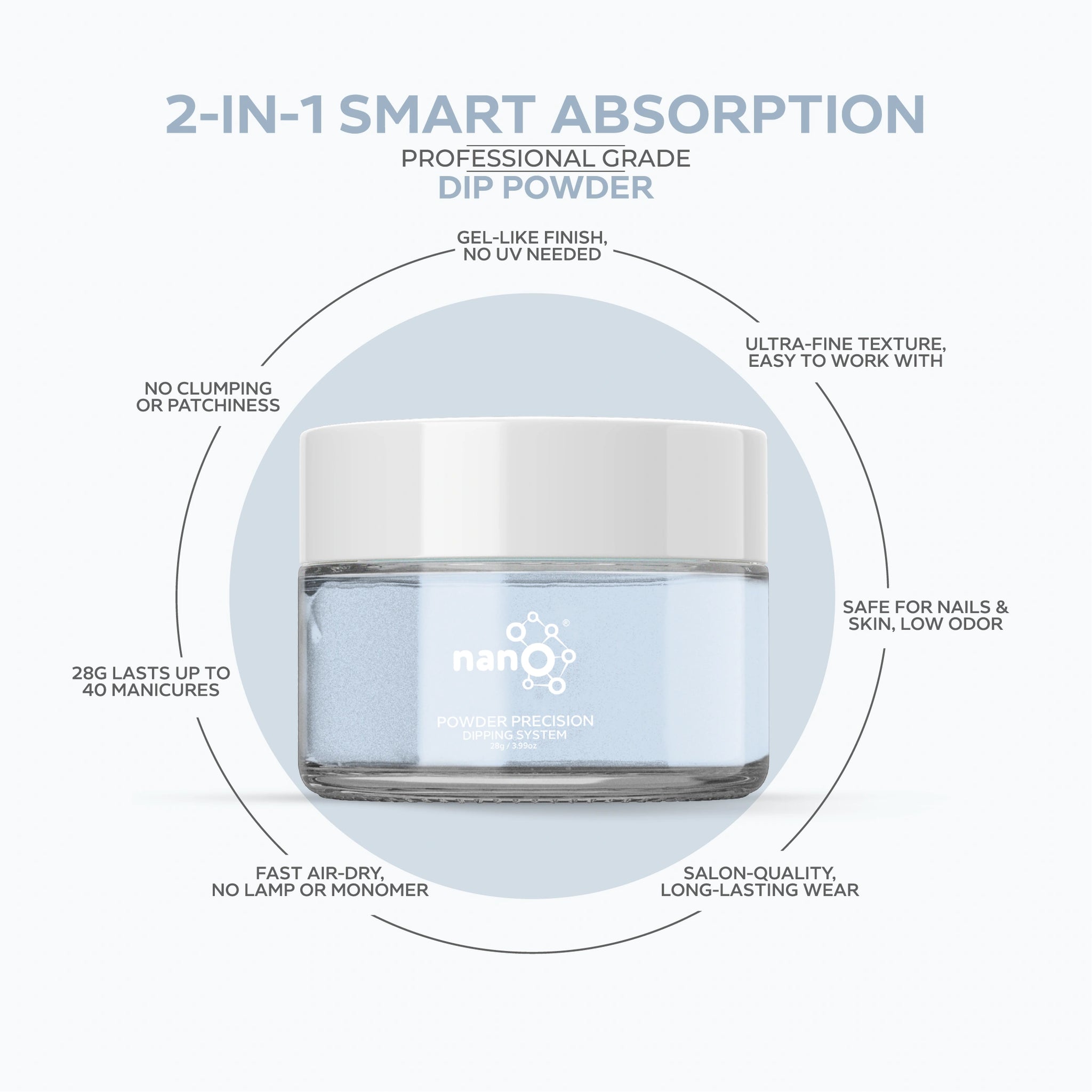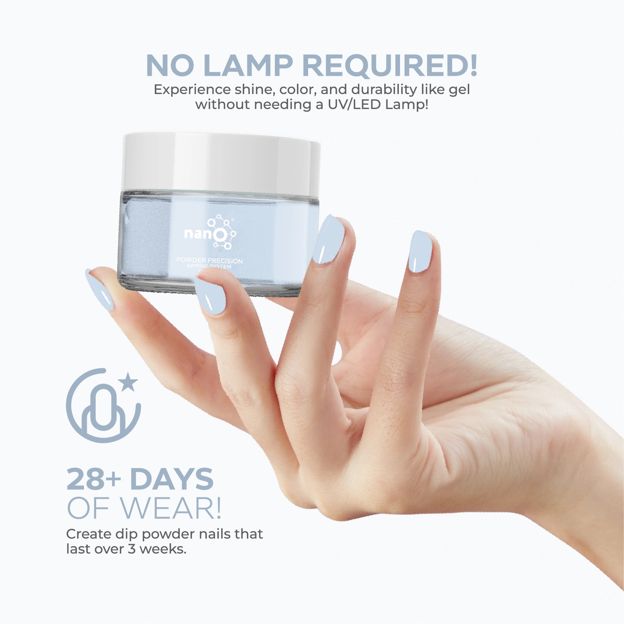- أضيفي البودرة: اغمسي أظافرك فورًا في بودرة Nano® Dip Powder أو رشي البودرة بالتساوي على الأظافر. قومي بإزالة أي بودرة زائدة برفق.