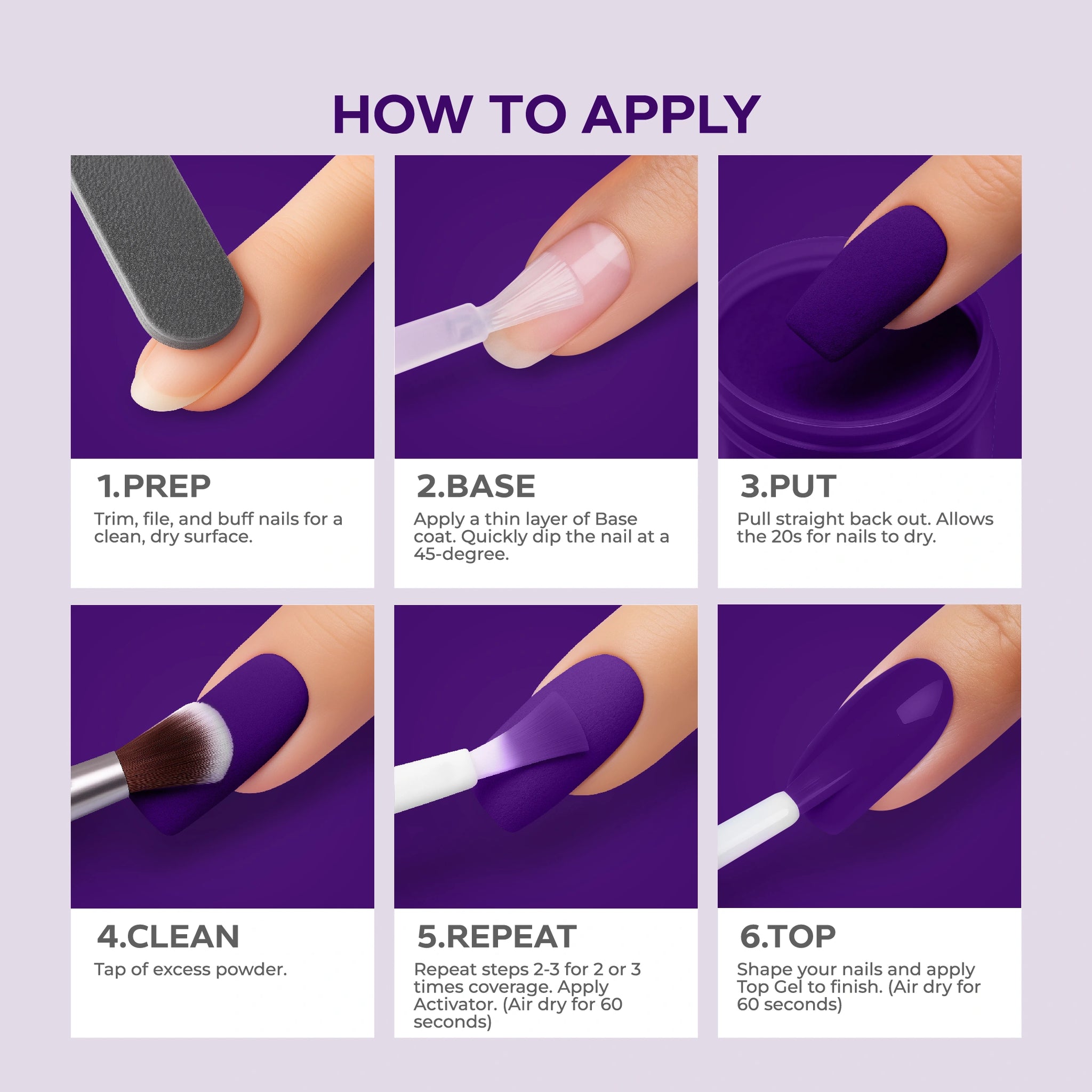 - أضيفي البودرة: اغمسي أظافرك فورًا في بودرة Nano® Dip Powder أو رشي البودرة بالتساوي على الأظافر. قومي بإزالة أي بودرة زائدة برفق.
