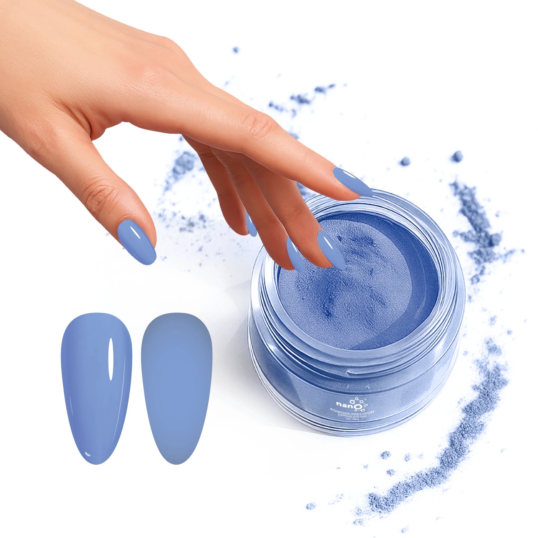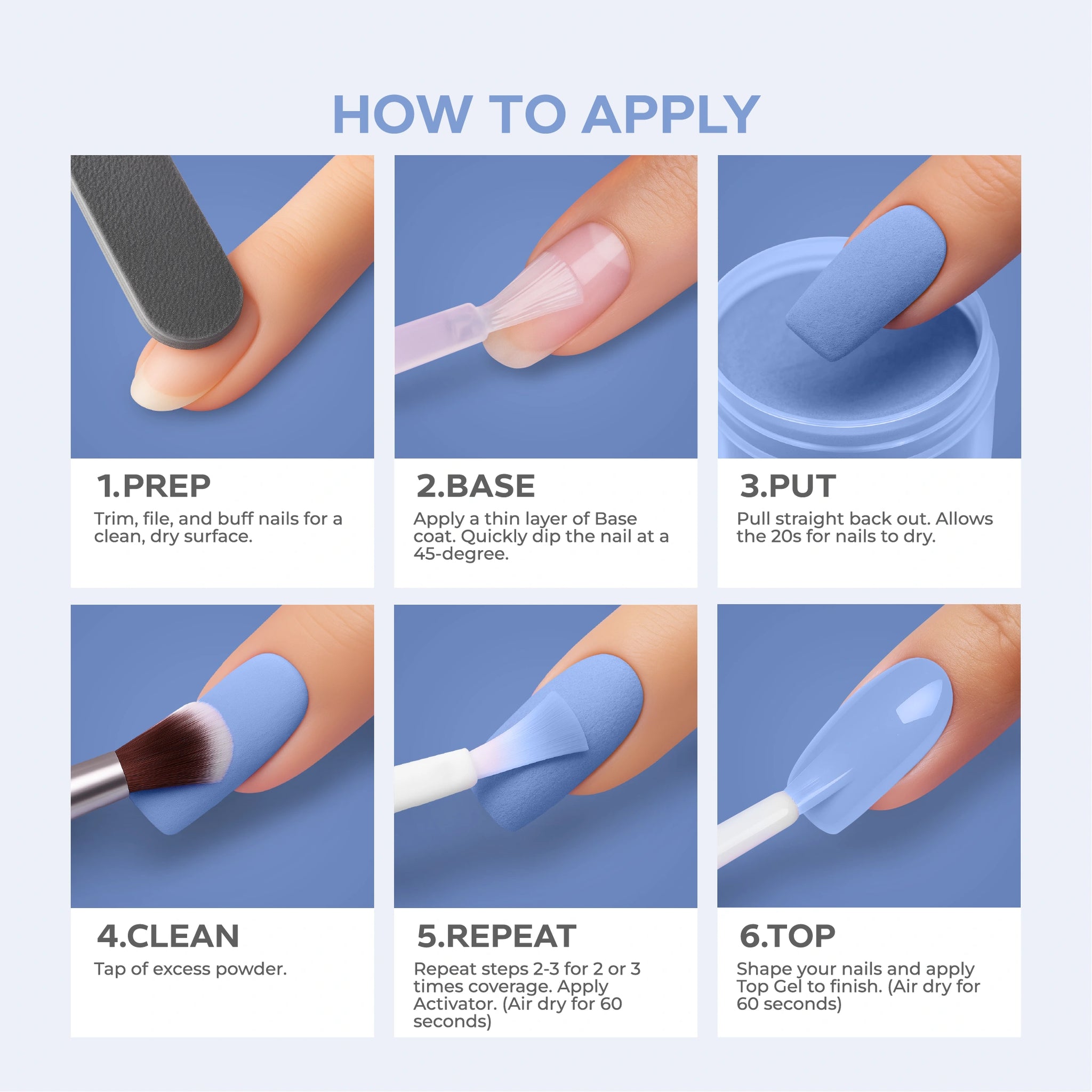- أضيفي البودرة: اغمسي أظافرك فورًا في بودرة Nano® Dip Powder أو رشي البودرة بالتساوي على الأظافر. قومي بإزالة أي بودرة زائدة برفق.