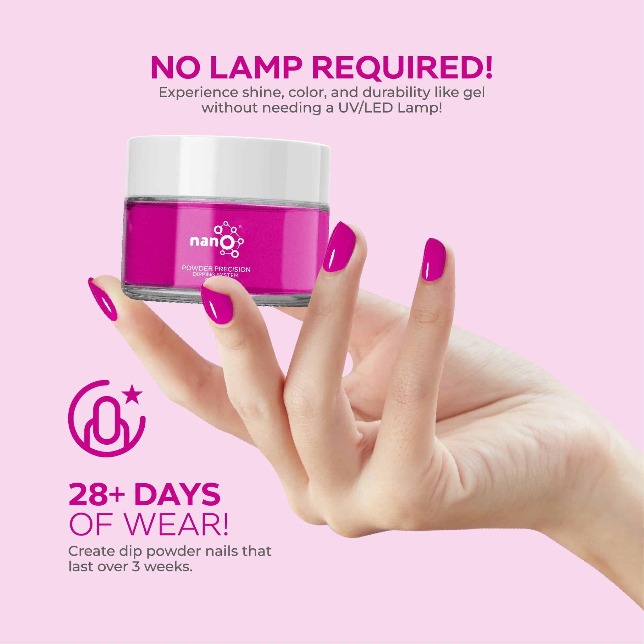 - أضيفي البودرة: اغمسي أظافرك فورًا في بودرة Nano® Dip Powder أو رشي البودرة بالتساوي على الأظافر. قومي بإزالة أي بودرة زائدة برفق.