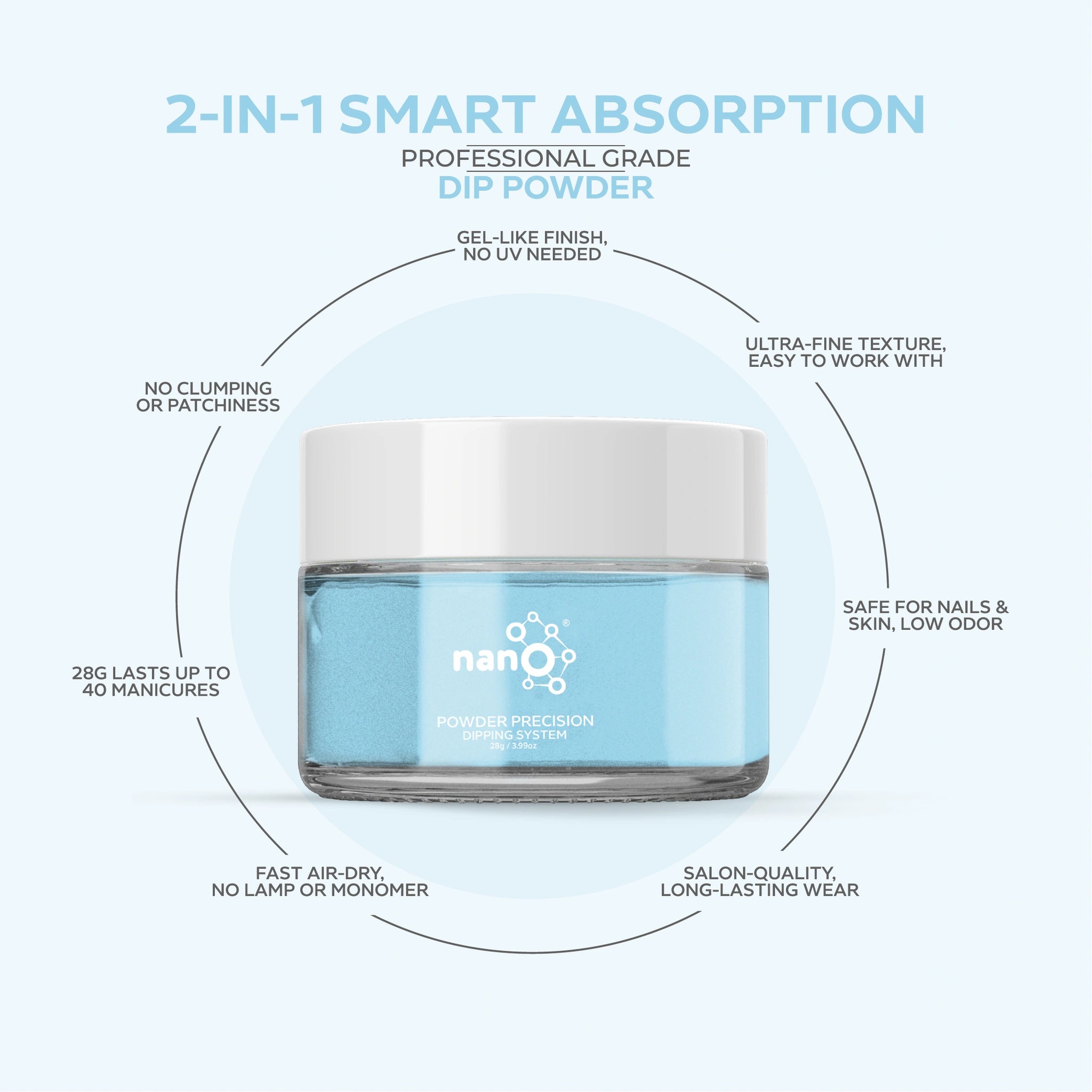 - أضيفي البودرة: اغمسي أظافرك فورًا في بودرة Nano® Dip Powder أو رشي البودرة بالتساوي على الأظافر. قومي بإزالة أي بودرة زائدة برفق.