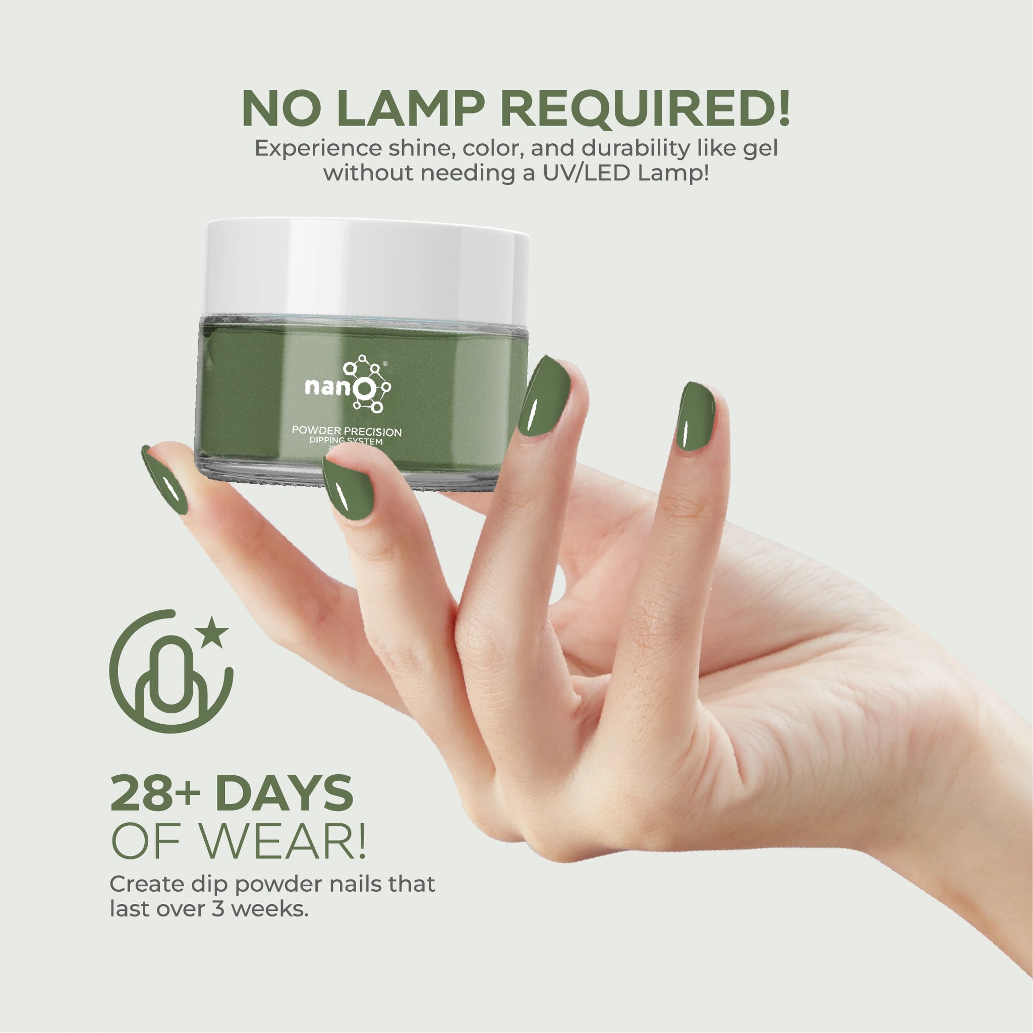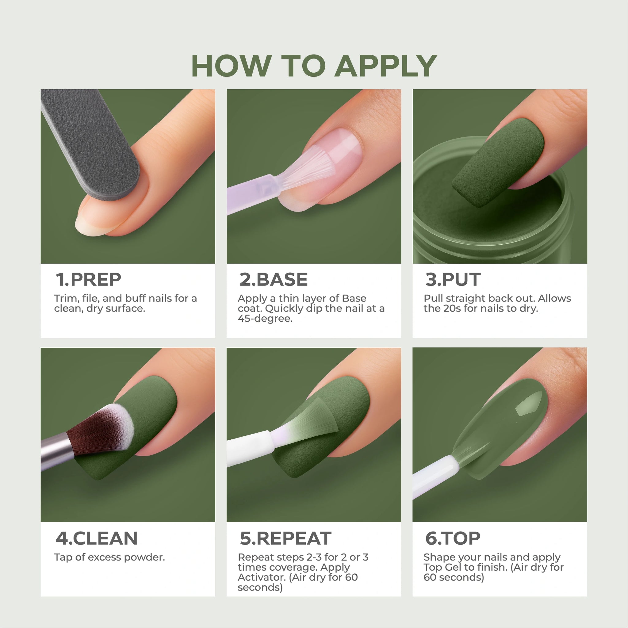 - أضيفي البودرة: اغمسي أظافرك فورًا في بودرة Nano® Dip Powder أو رشي البودرة بالتساوي على الأظافر. قومي بإزالة أي بودرة زائدة برفق.