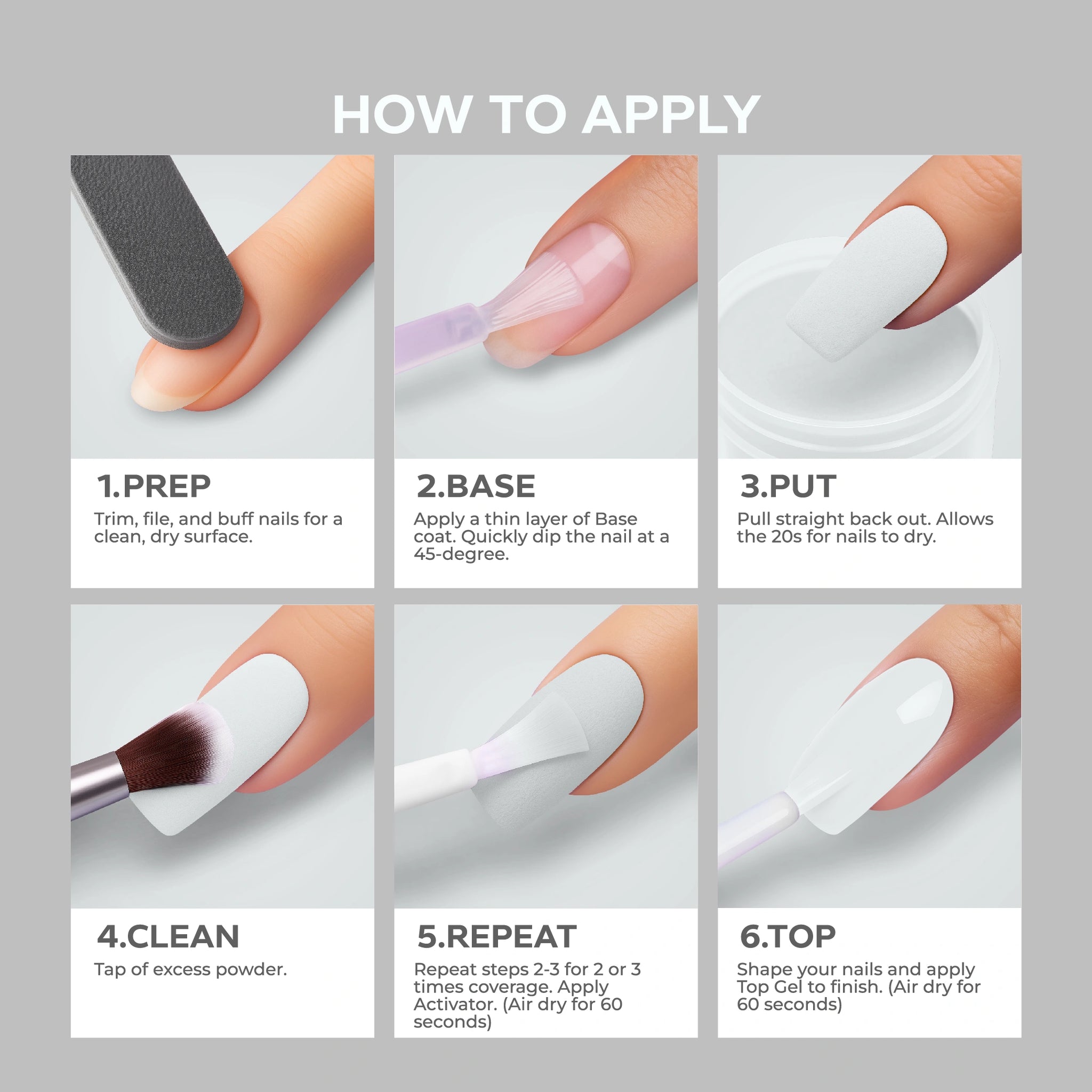 - أضيفي البودرة: اغمسي أظافرك فورًا في بودرة Nano® Dip Powder أو رشي البودرة بالتساوي على الأظافر. قومي بإزالة أي بودرة زائدة برفق.