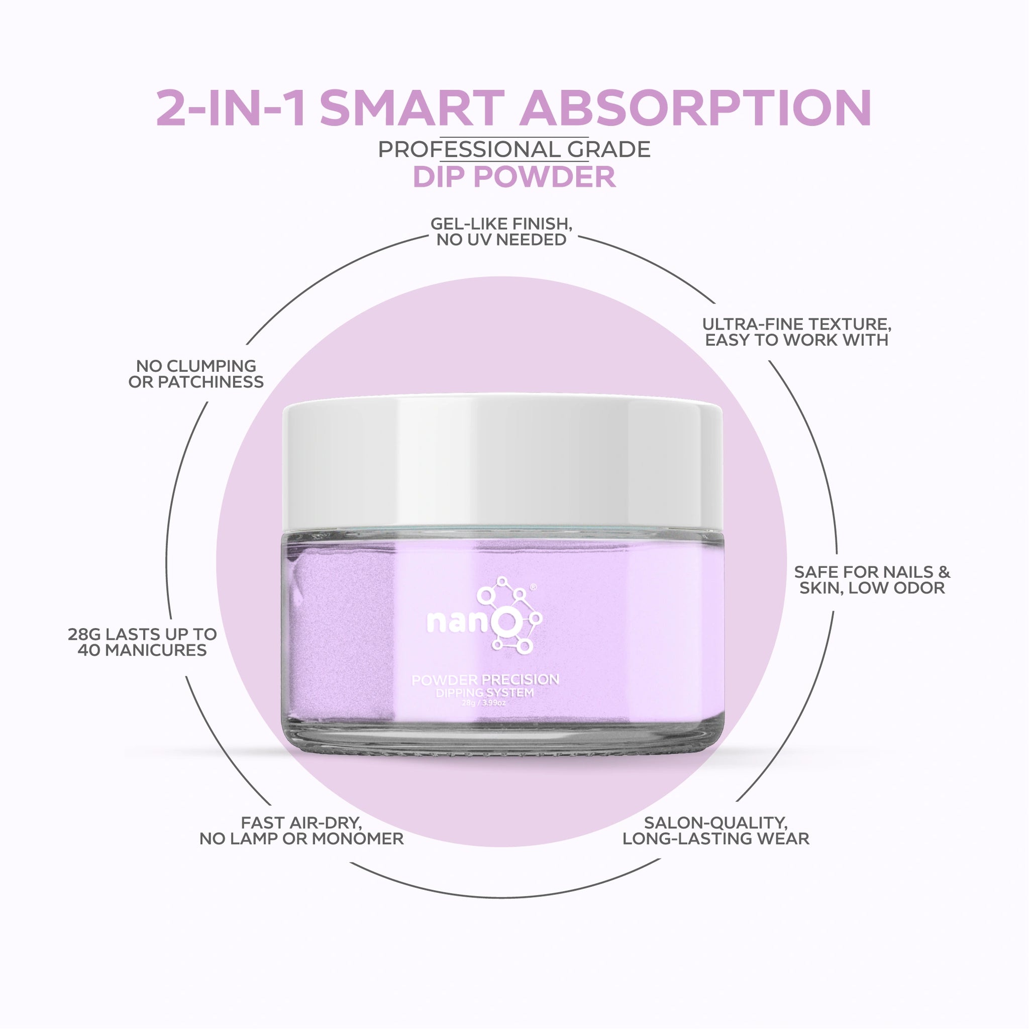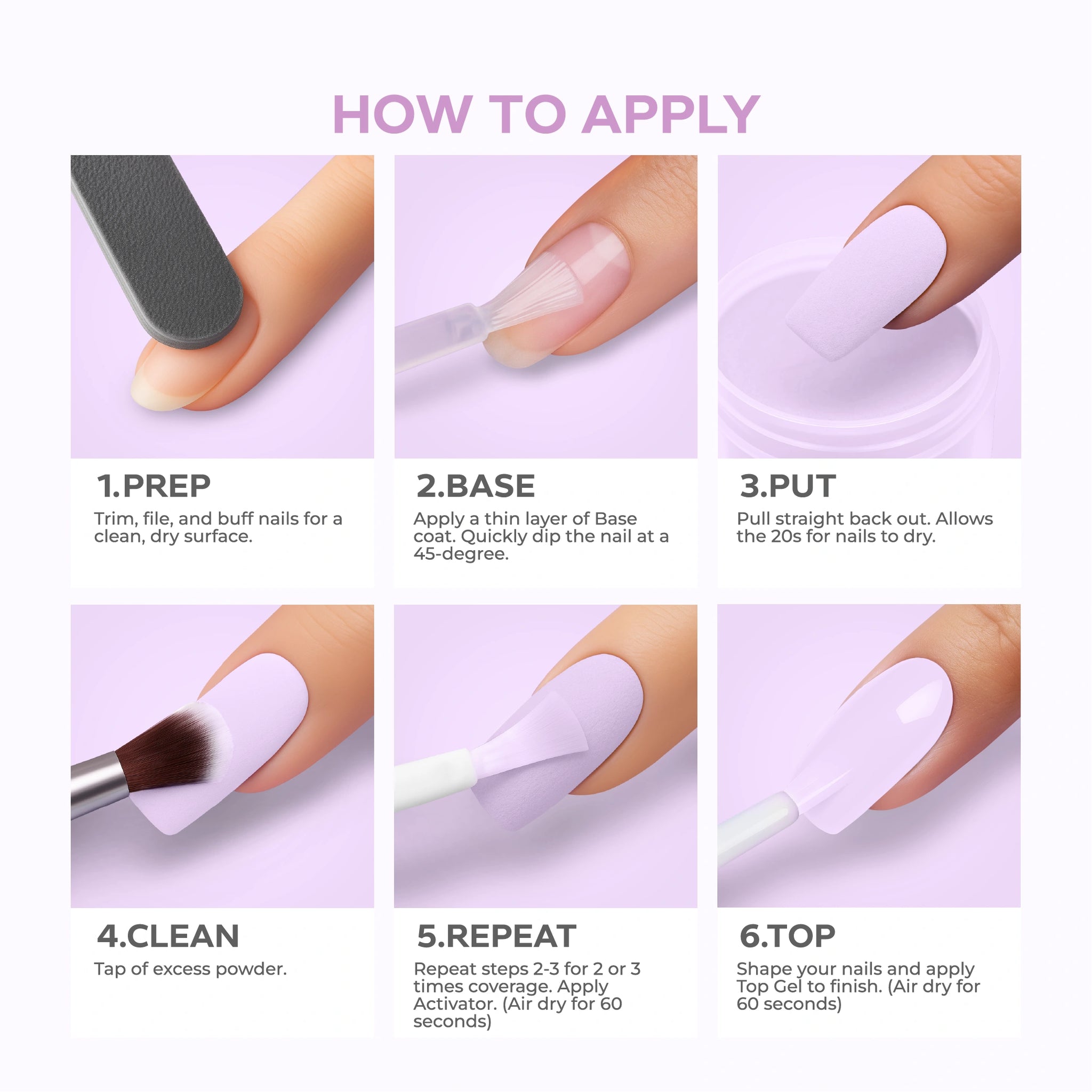 - أضيفي البودرة: اغمسي أظافرك فورًا في بودرة Nano® Dip Powder أو رشي البودرة بالتساوي على الأظافر. قومي بإزالة أي بودرة زائدة برفق.