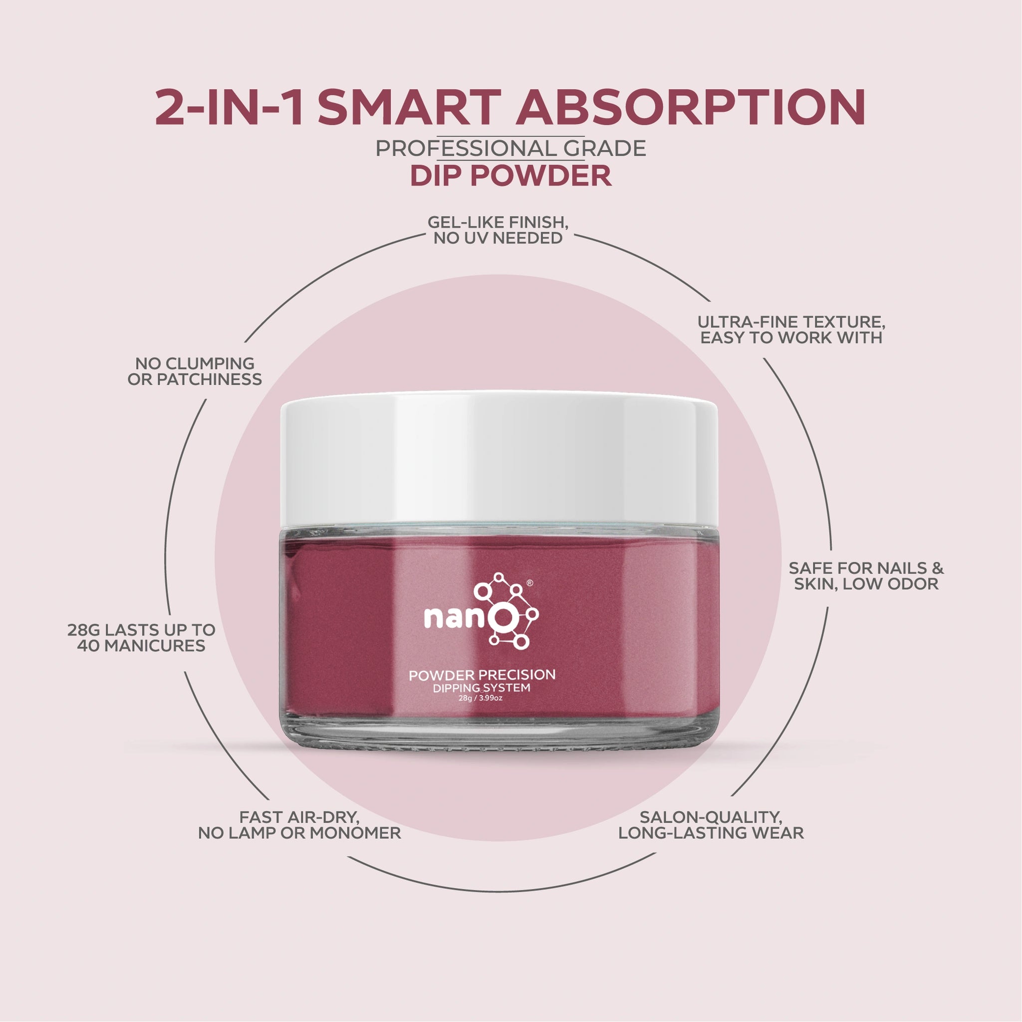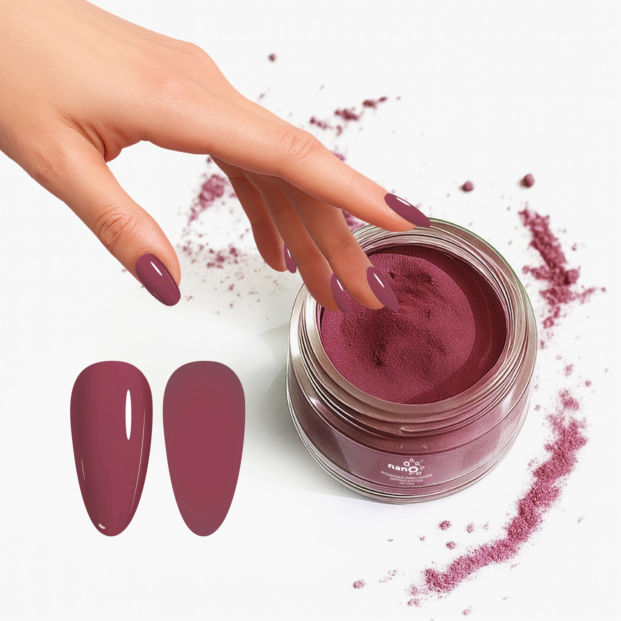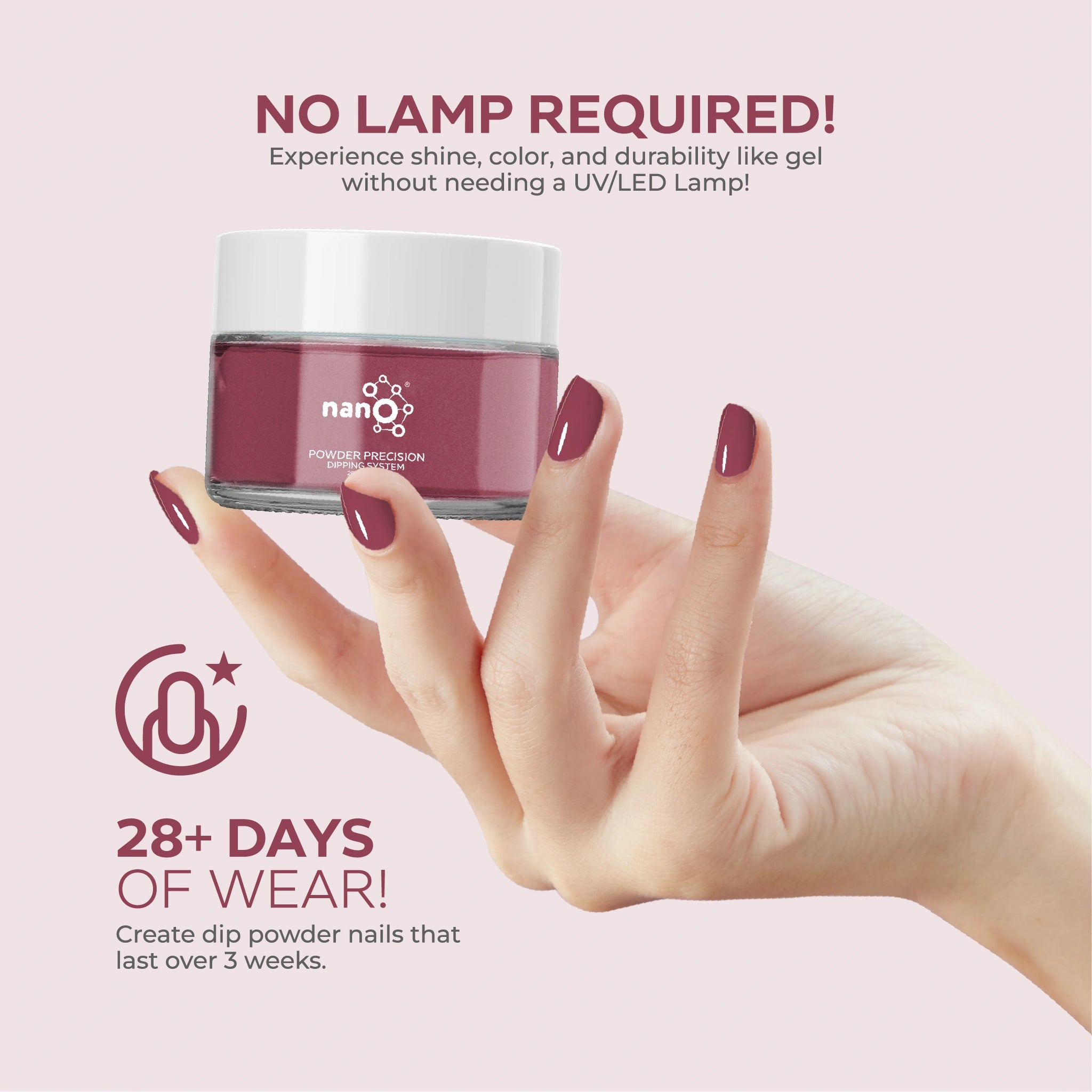 - أضيفي البودرة: اغمسي أظافرك فورًا في بودرة Nano® Dip Powder أو رشي البودرة بالتساوي على الأظافر. قومي بإزالة أي بودرة زائدة برفق.