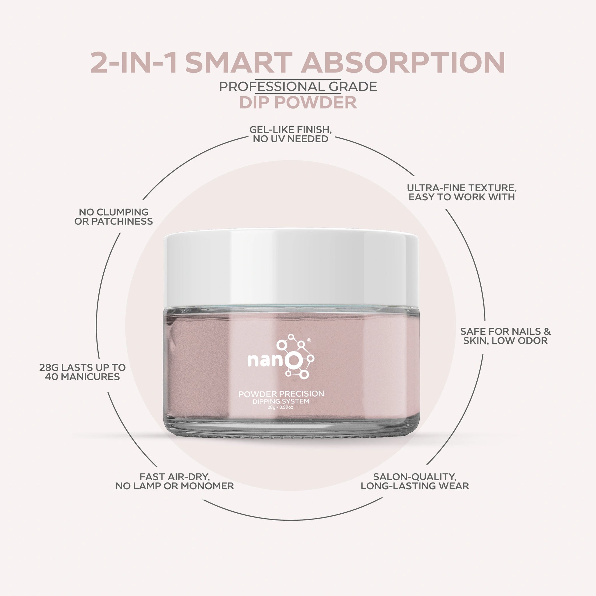 - أضيفي البودرة: اغمسي أظافرك فورًا في بودرة Nano® Dip Powder أو رشي البودرة بالتساوي على الأظافر. قومي بإزالة أي بودرة زائدة برفق.
