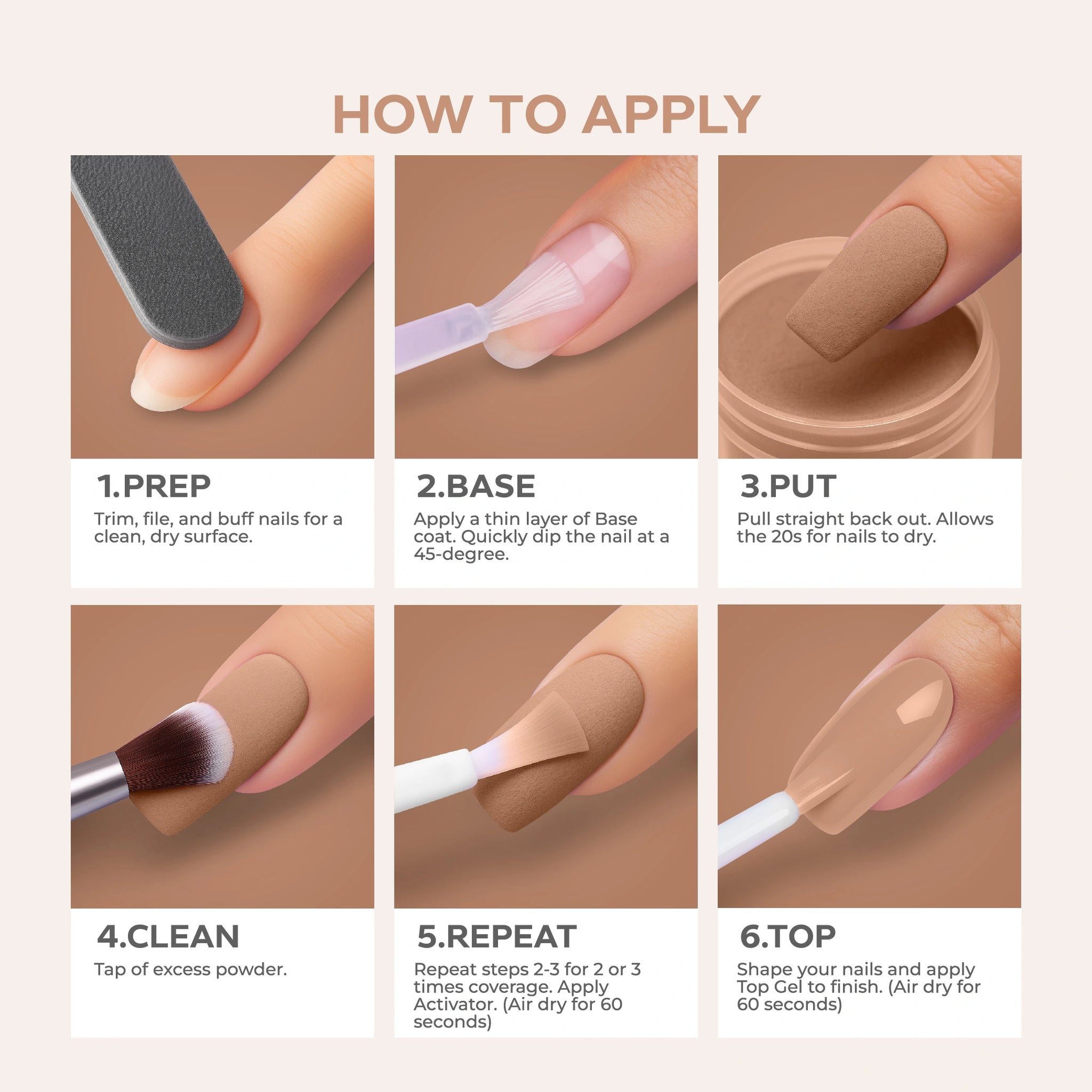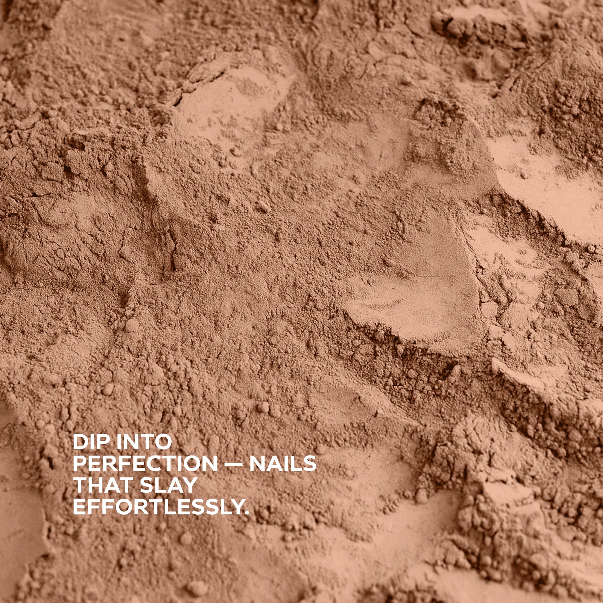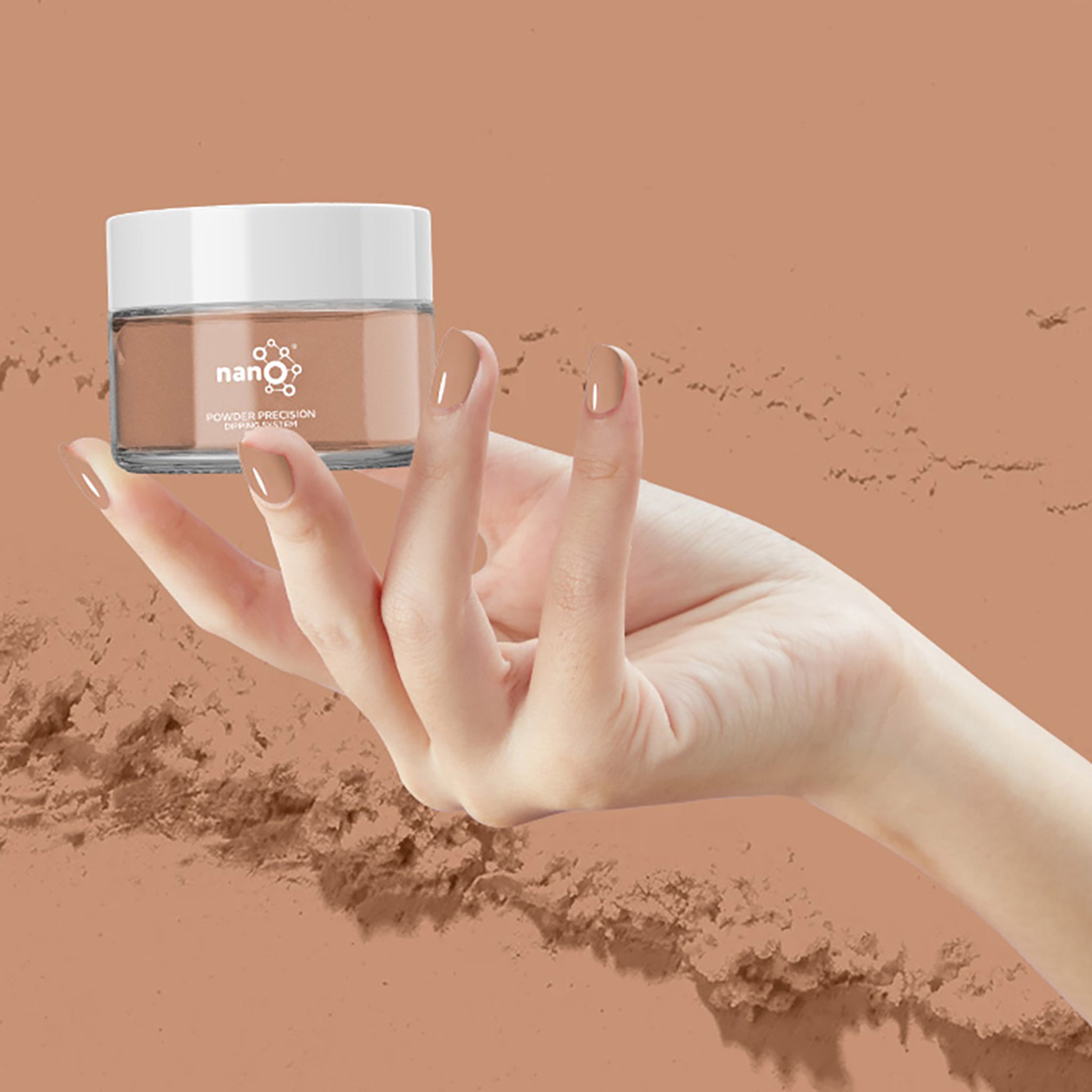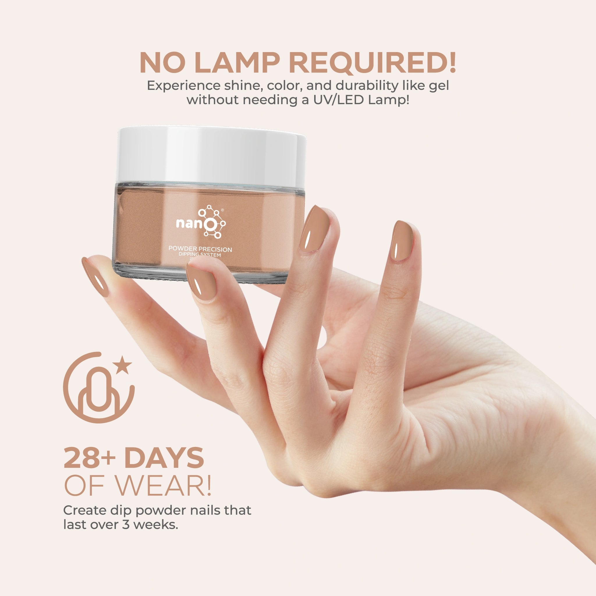 - أضيفي البودرة: اغمسي أظافرك فورًا في بودرة Nano® Dip Powder أو رشي البودرة بالتساوي على الأظافر. قومي بإزالة أي بودرة زائدة برفق.