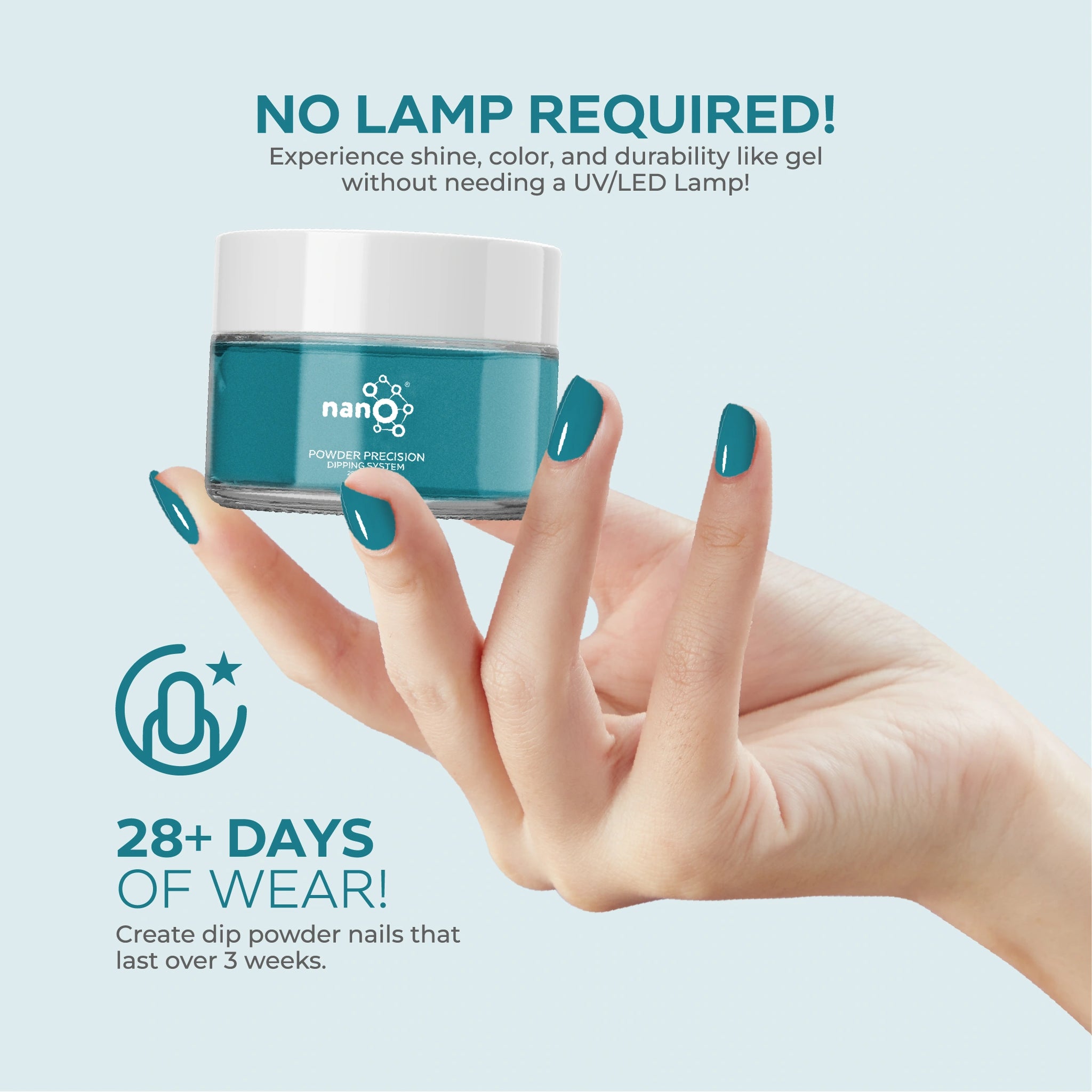 - أضيفي البودرة: اغمسي أظافرك فورًا في بودرة Nano® Dip Powder أو رشي البودرة بالتساوي على الأظافر. قومي بإزالة أي بودرة زائدة برفق.