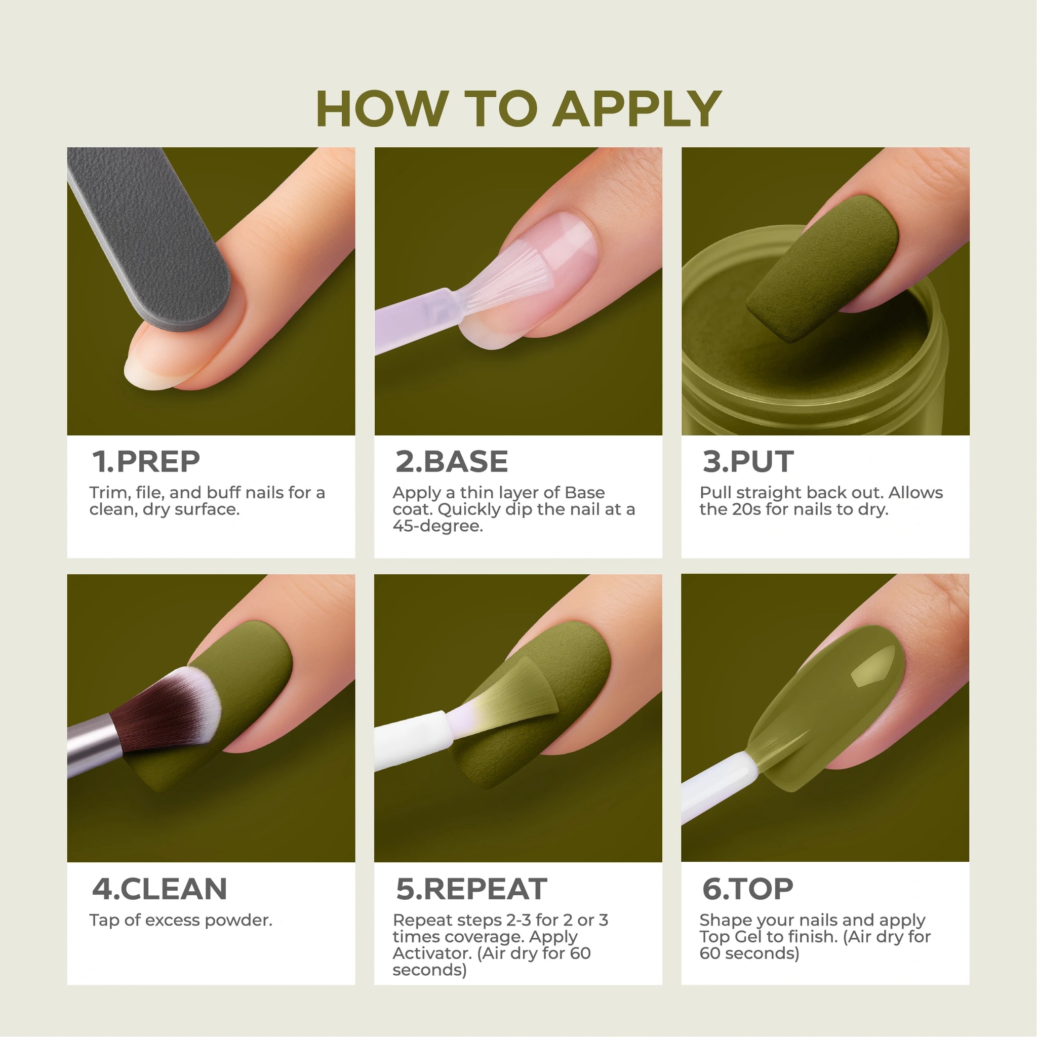 - أضيفي البودرة: اغمسي أظافرك فورًا في بودرة Nano® Dip Powder أو رشي البودرة بالتساوي على الأظافر. قومي بإزالة أي بودرة زائدة برفق.