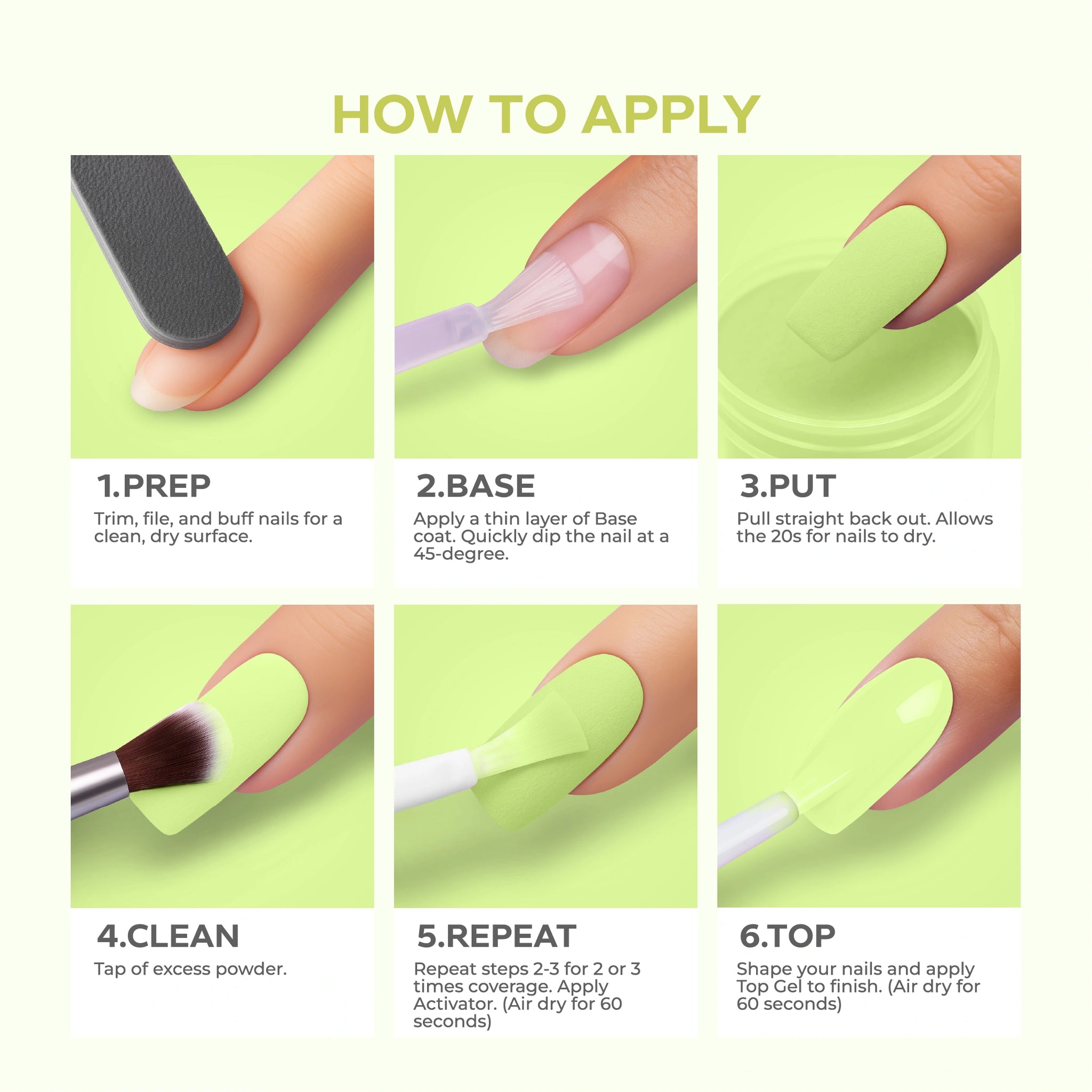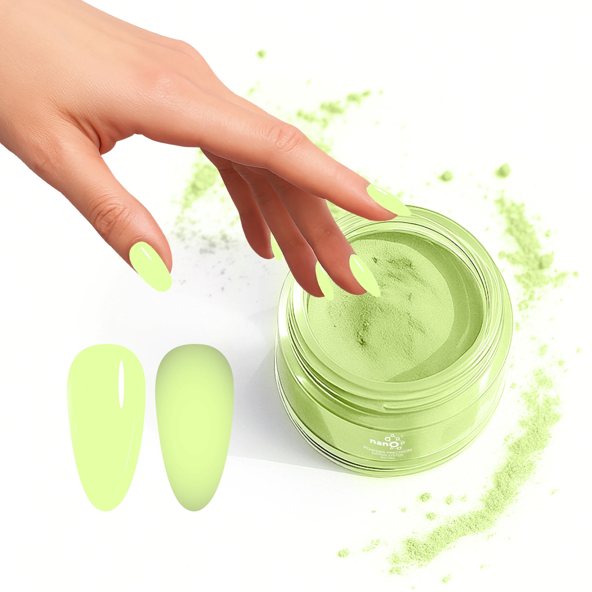 - أضيفي البودرة: اغمسي أظافرك فورًا في بودرة Nano® Dip Powder أو رشي البودرة بالتساوي على الأظافر. قومي بإزالة أي بودرة زائدة برفق.