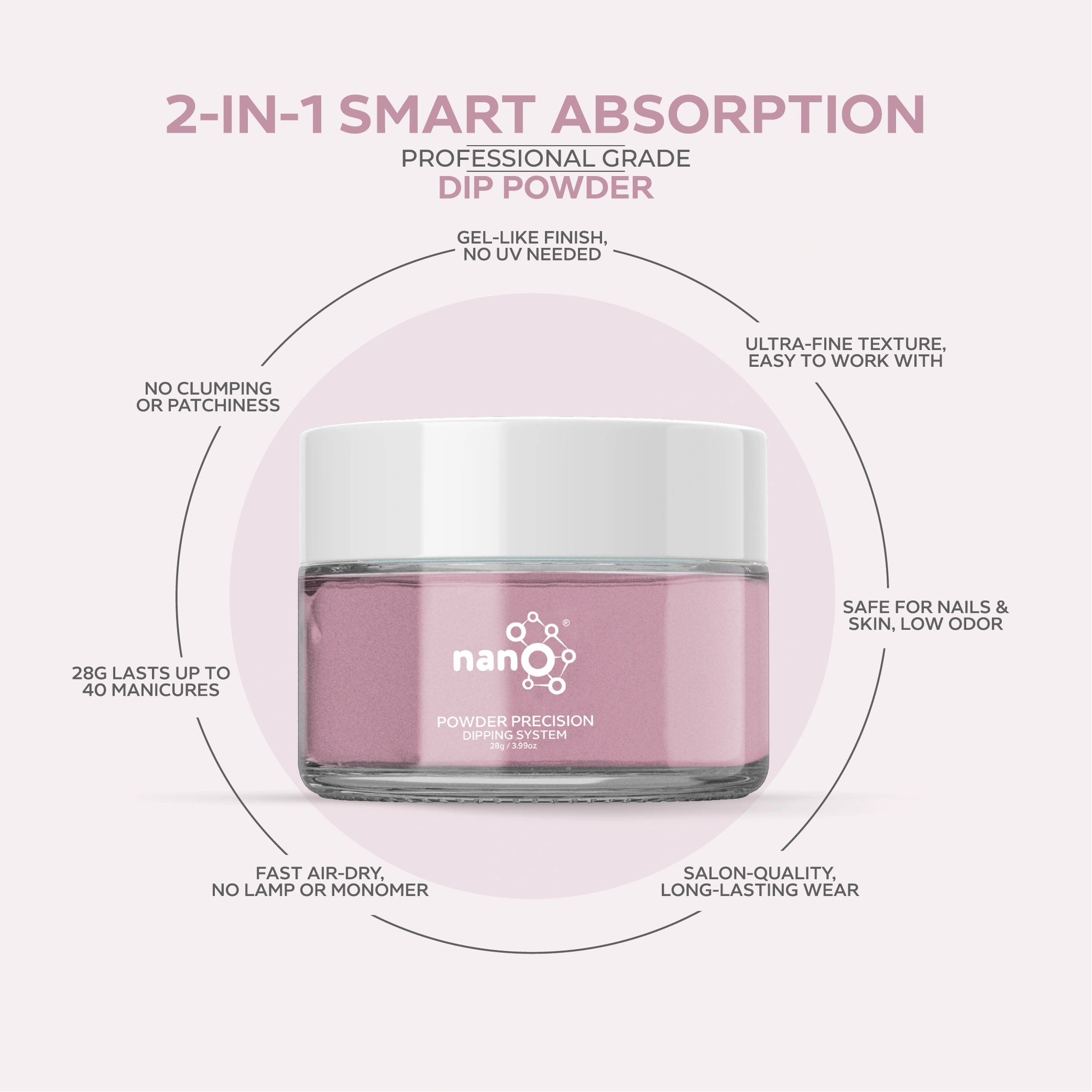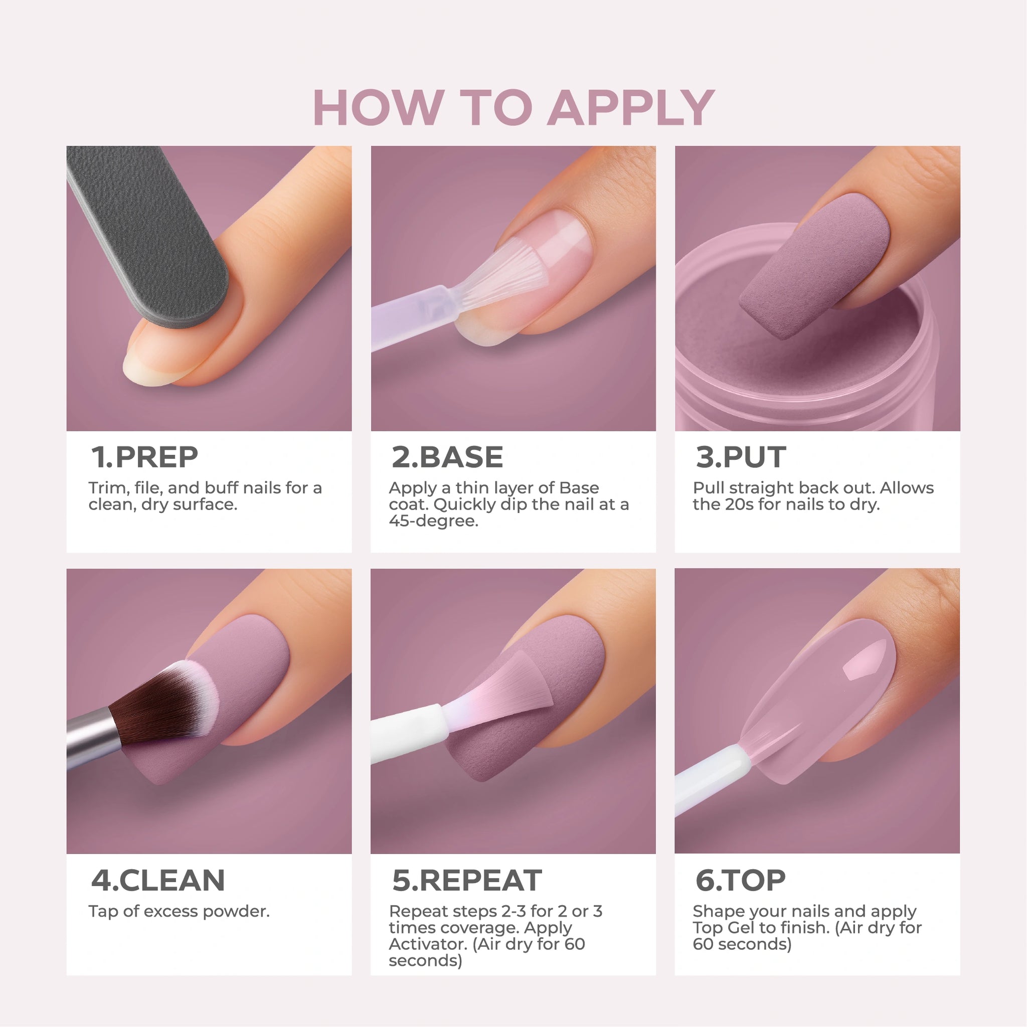 - أضيفي البودرة: اغمسي أظافرك فورًا في بودرة Nano® Dip Powder أو رشي البودرة بالتساوي على الأظافر. قومي بإزالة أي بودرة زائدة برفق.