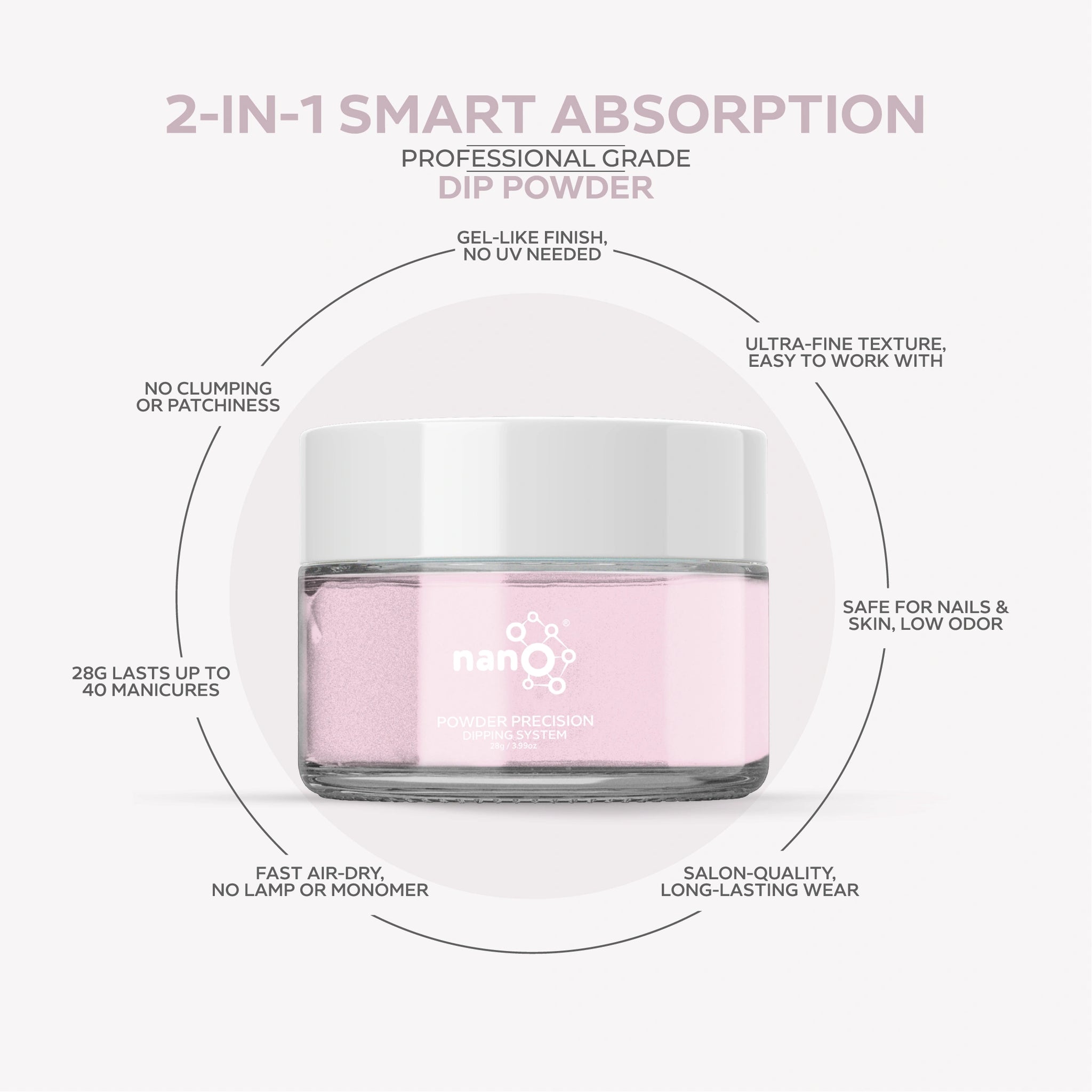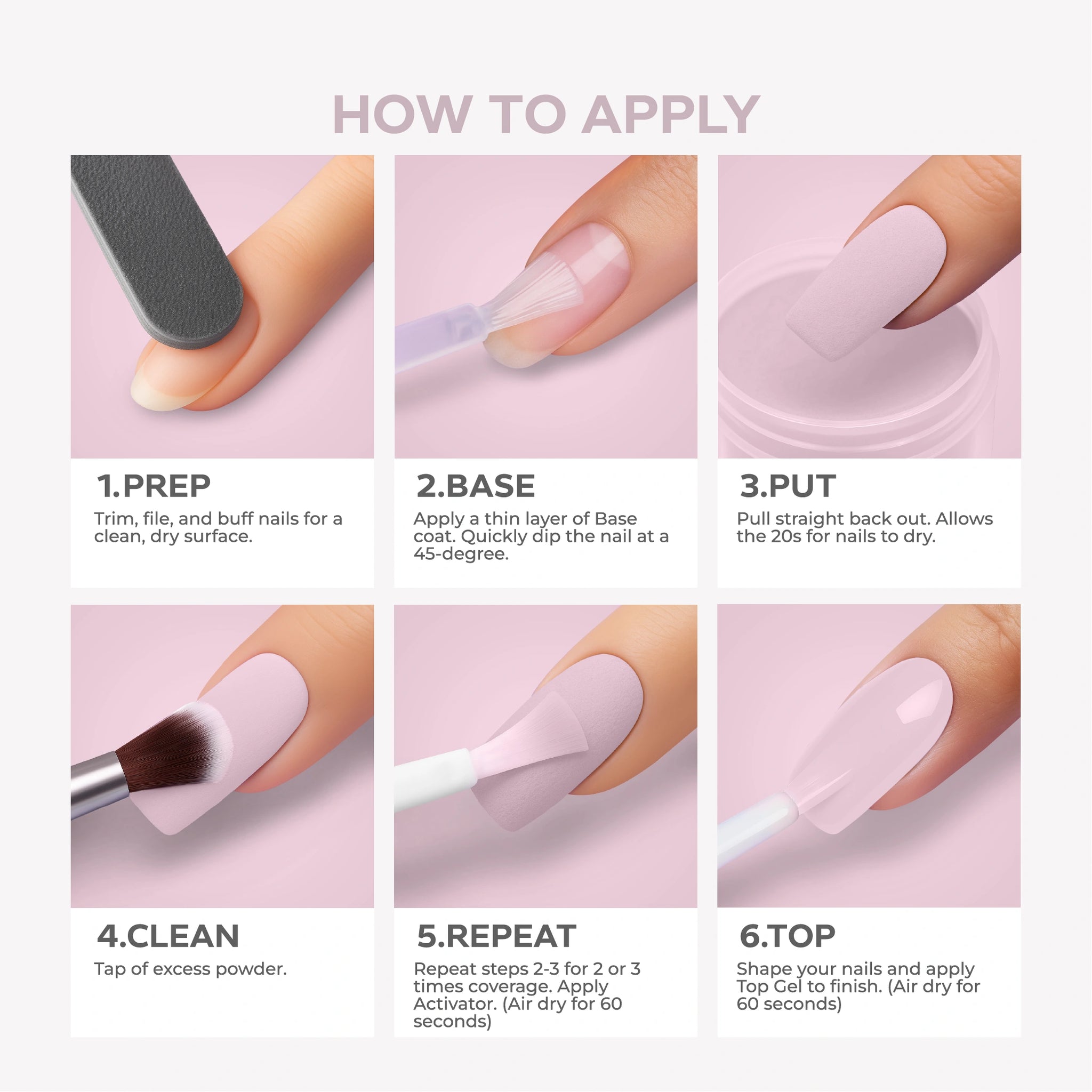 - أضيفي البودرة: اغمسي أظافرك فورًا في بودرة Nano® Dip Powder أو رشي البودرة بالتساوي على الأظافر. قومي بإزالة أي بودرة زائدة برفق.