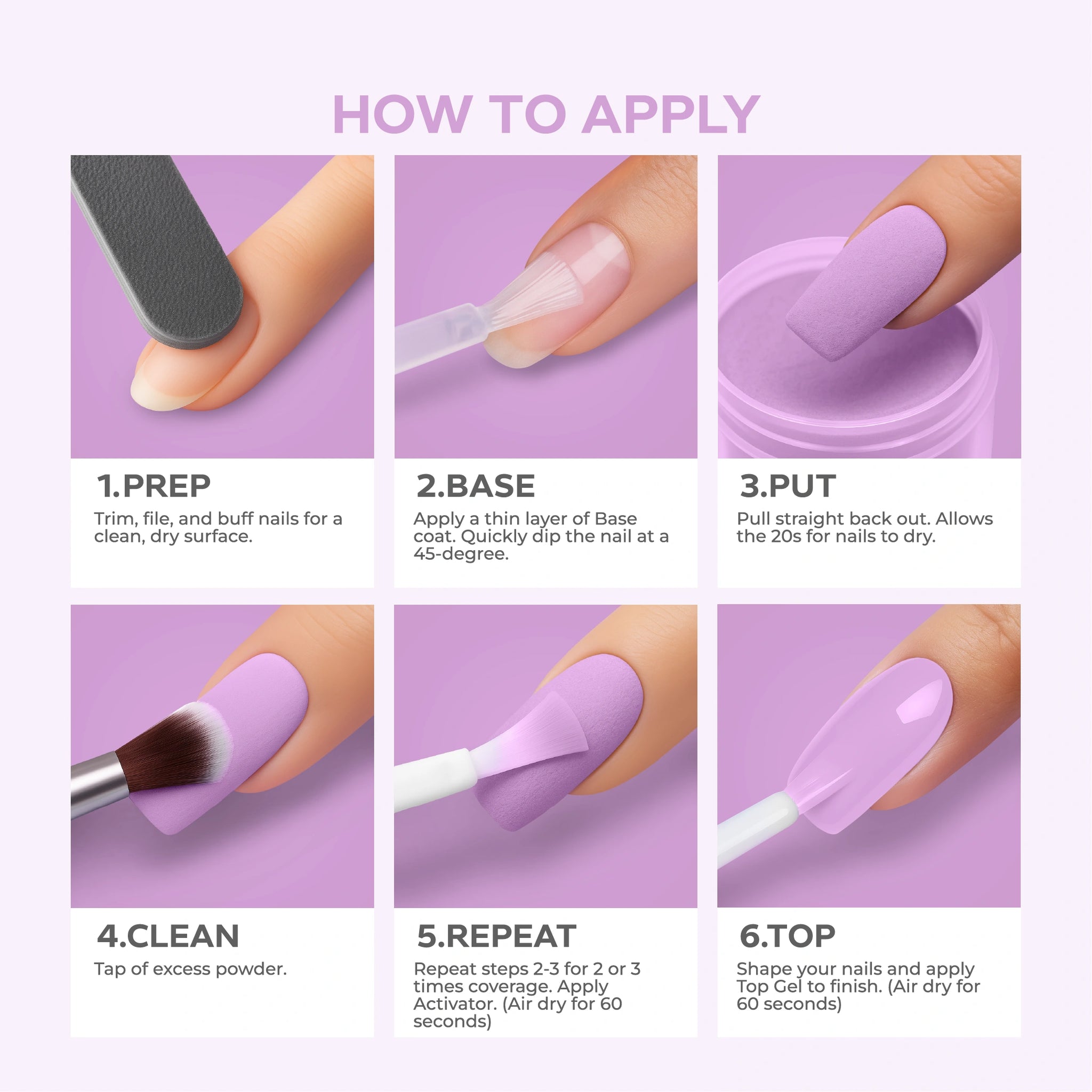 - أضيفي البودرة: اغمسي أظافرك فورًا في بودرة Nano® Dip Powder أو رشي البودرة بالتساوي على الأظافر. قومي بإزالة أي بودرة زائدة برفق.