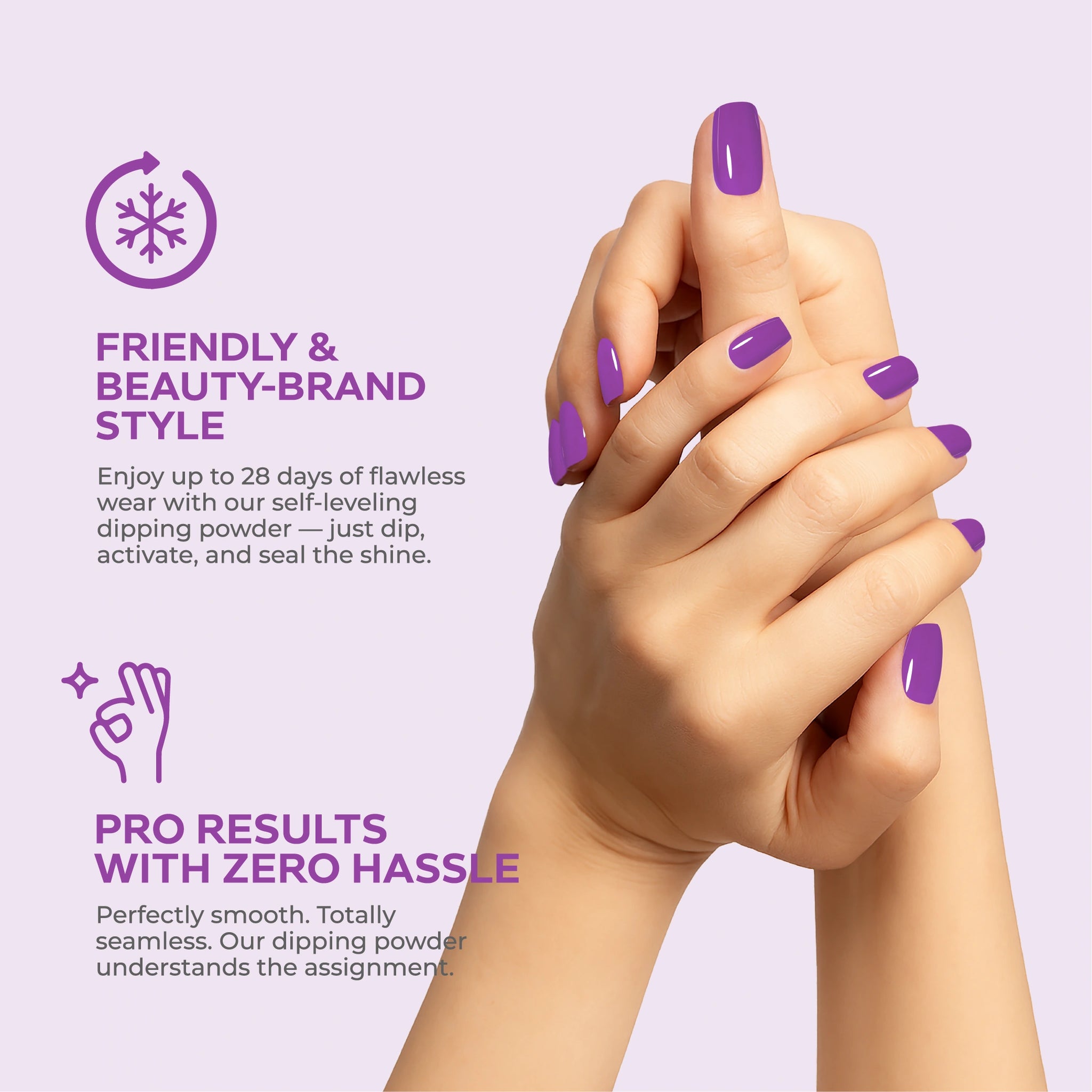 • احصلي على لمسة نهائية بجودة الصالون باستخدام نظام مسحوق الغمس البسيط وسهل الاستخدام.