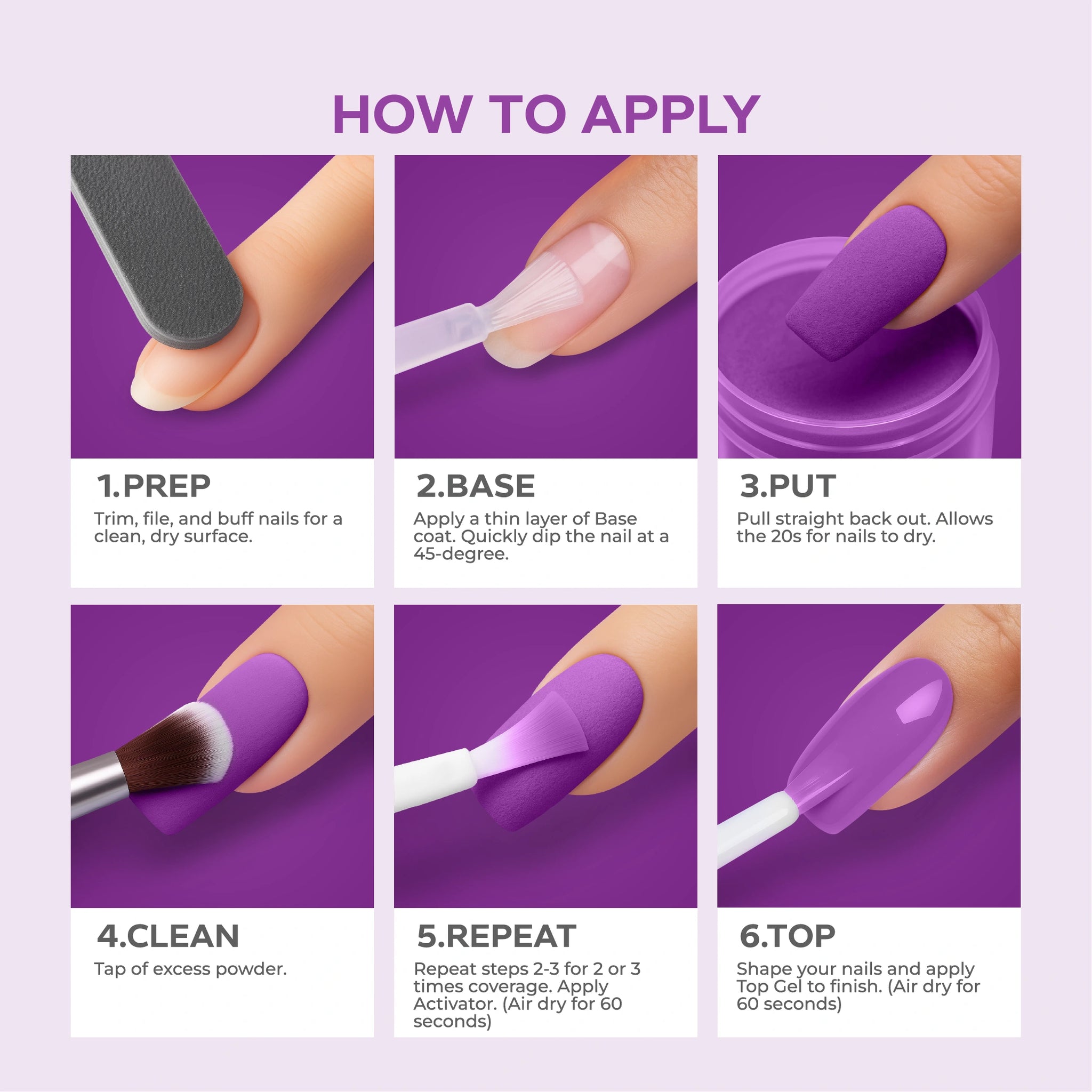 - أضيفي البودرة: اغمسي أظافرك فورًا في بودرة Nano® Dip Powder أو رشي البودرة بالتساوي على الأظافر. قومي بإزالة أي بودرة زائدة برفق.