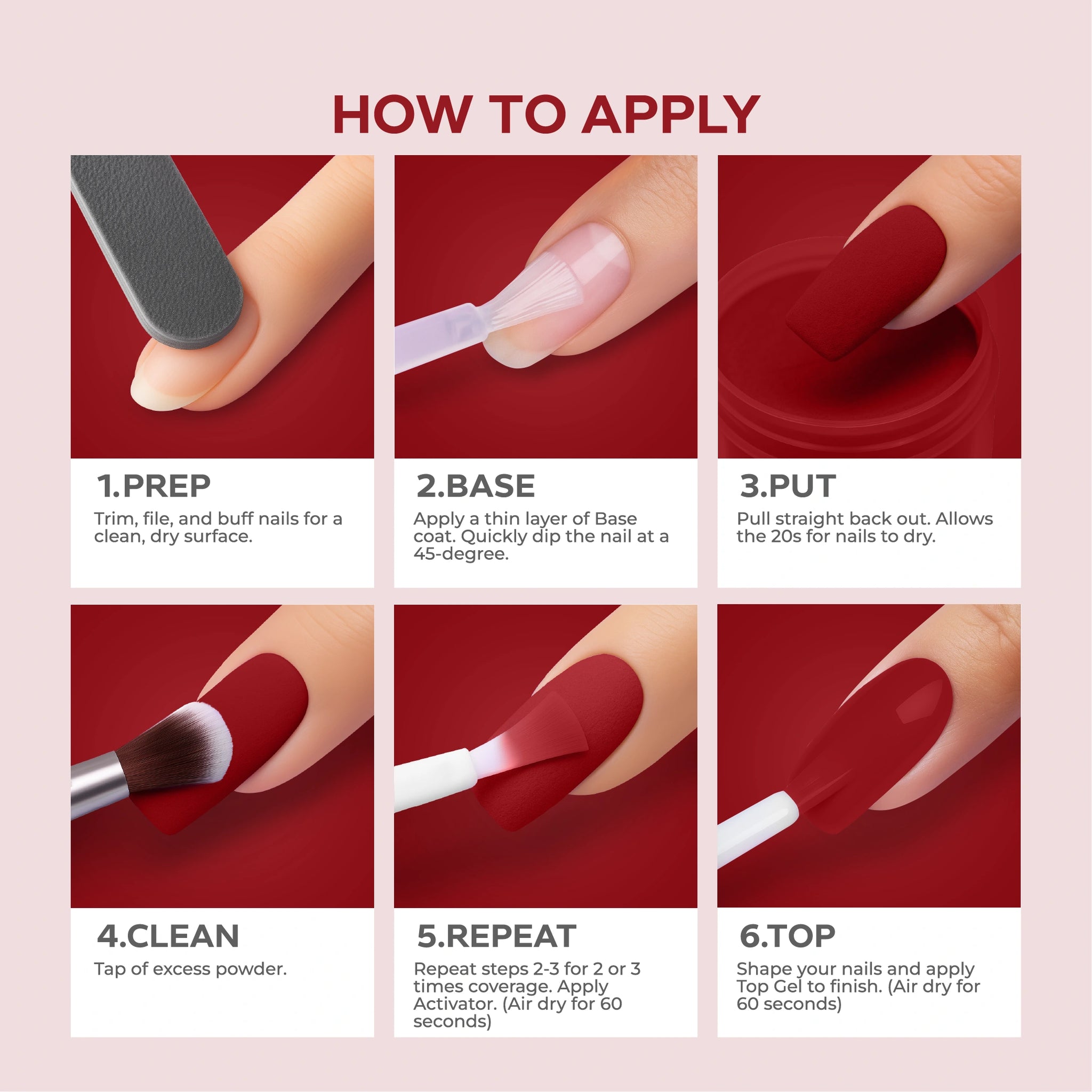 - احصلي على لمسة نهائية بجودة الصالون باستخدام نظام مسحوق الغمس البسيط وسهل الاستخدام.