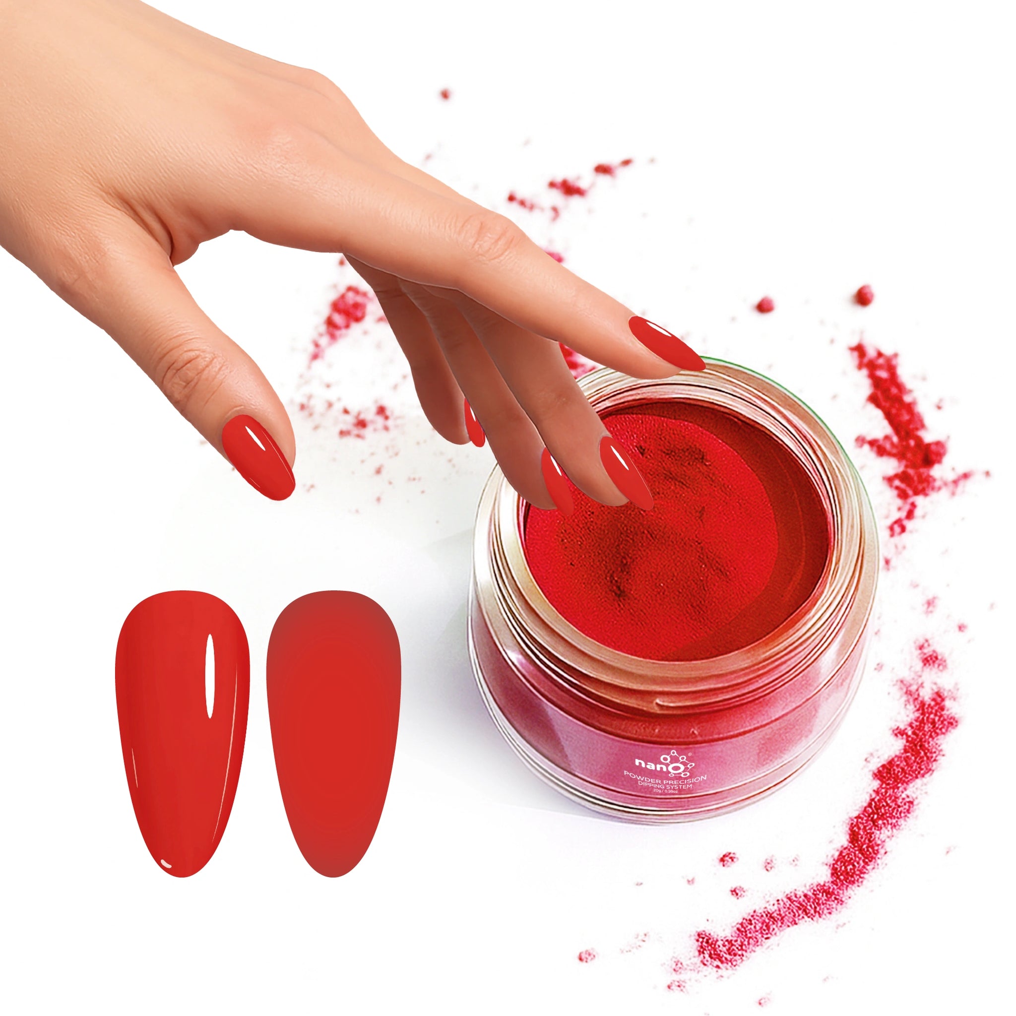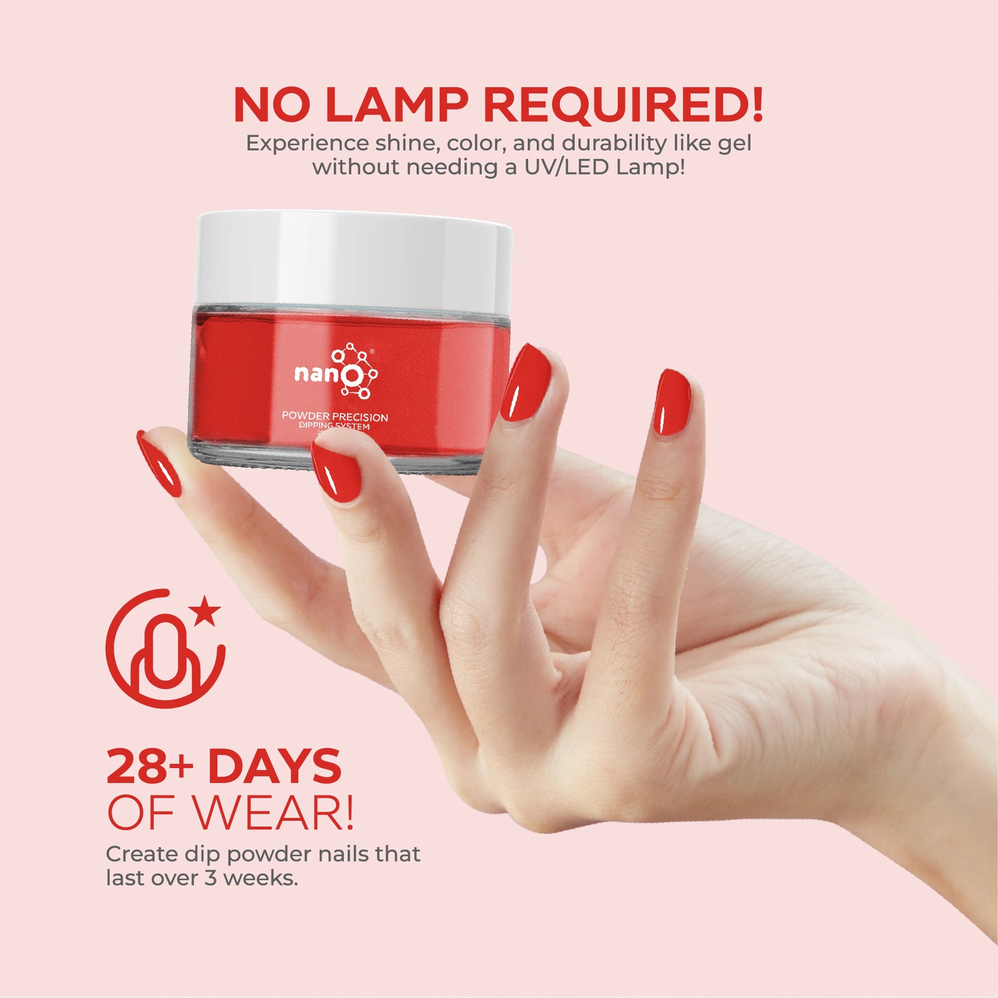 - أضيفي البودرة: اغمسي أظافرك فورًا في بودرة Nano® Dip Powder أو رشي البودرة بالتساوي على الأظافر. قومي بإزالة أي بودرة زائدة برفق.