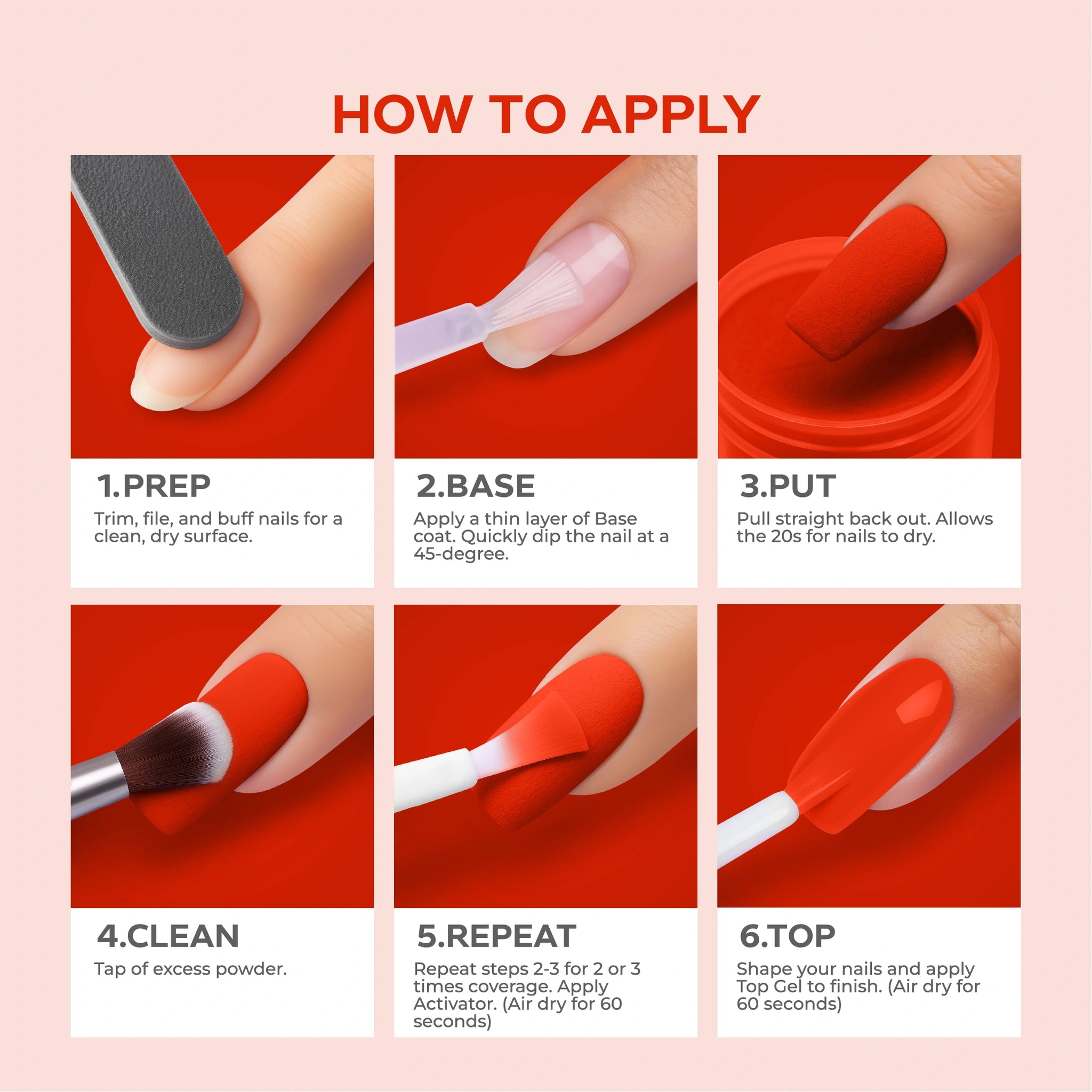 - أضيفي البودرة: اغمسي أظافرك فورًا في بودرة Nano® Dip Powder أو رشي البودرة بالتساوي على الأظافر. قومي بإزالة أي بودرة زائدة برفق.