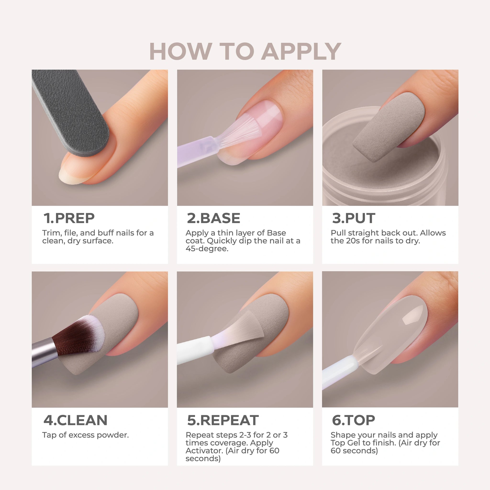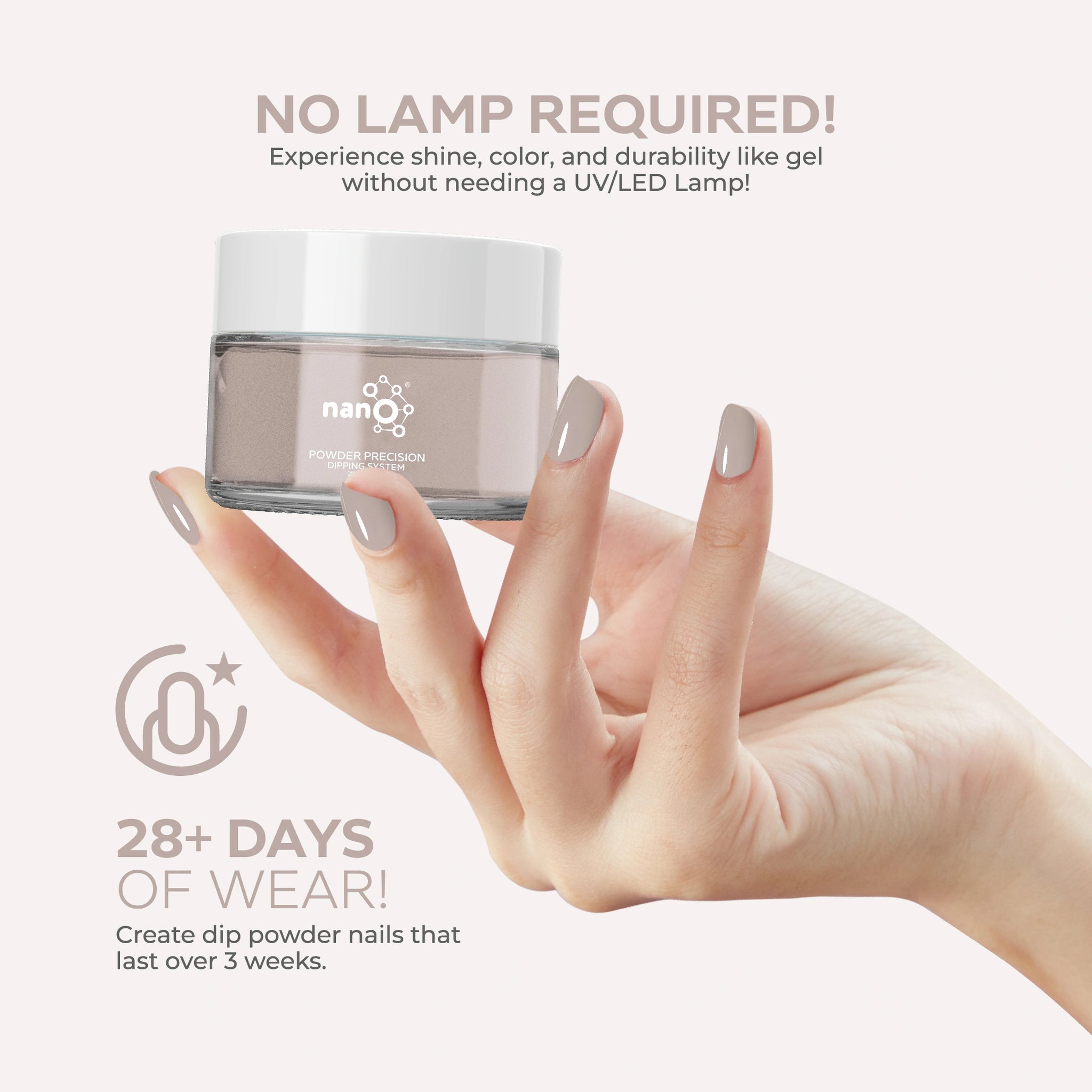- أضيفي البودرة: اغمسي أظافرك فورًا في بودرة Nano® Dip Powder أو رشي البودرة بالتساوي على الأظافر. قومي بإزالة أي بودرة زائدة برفق.