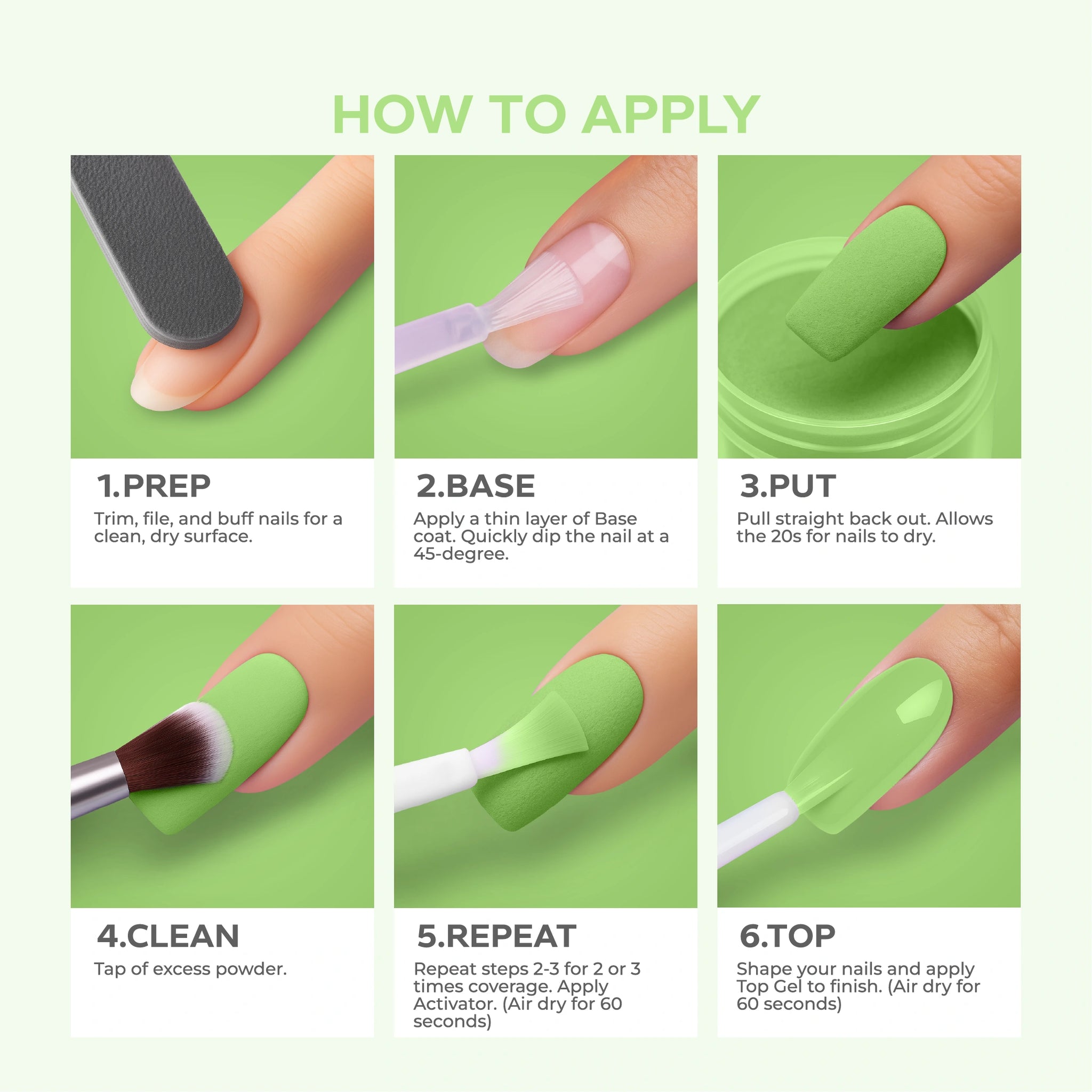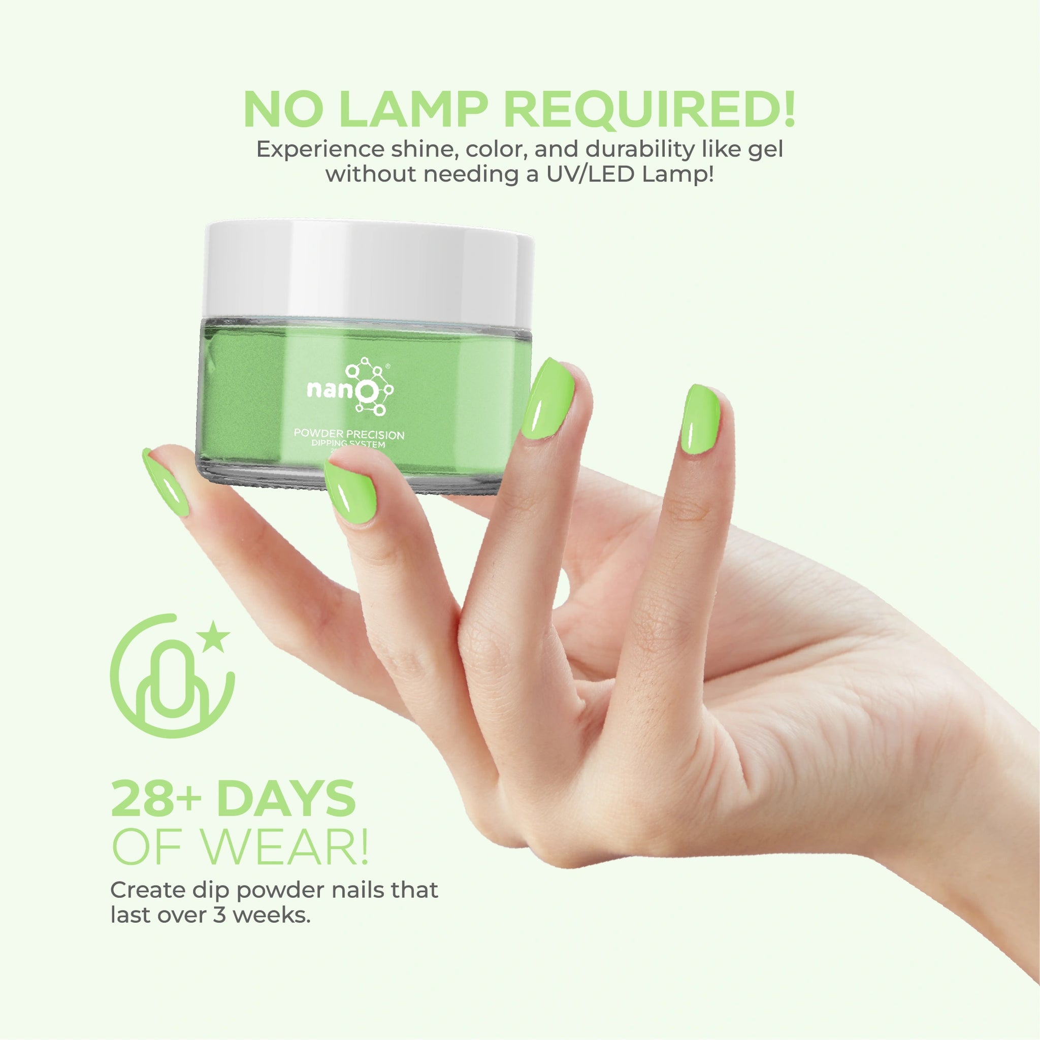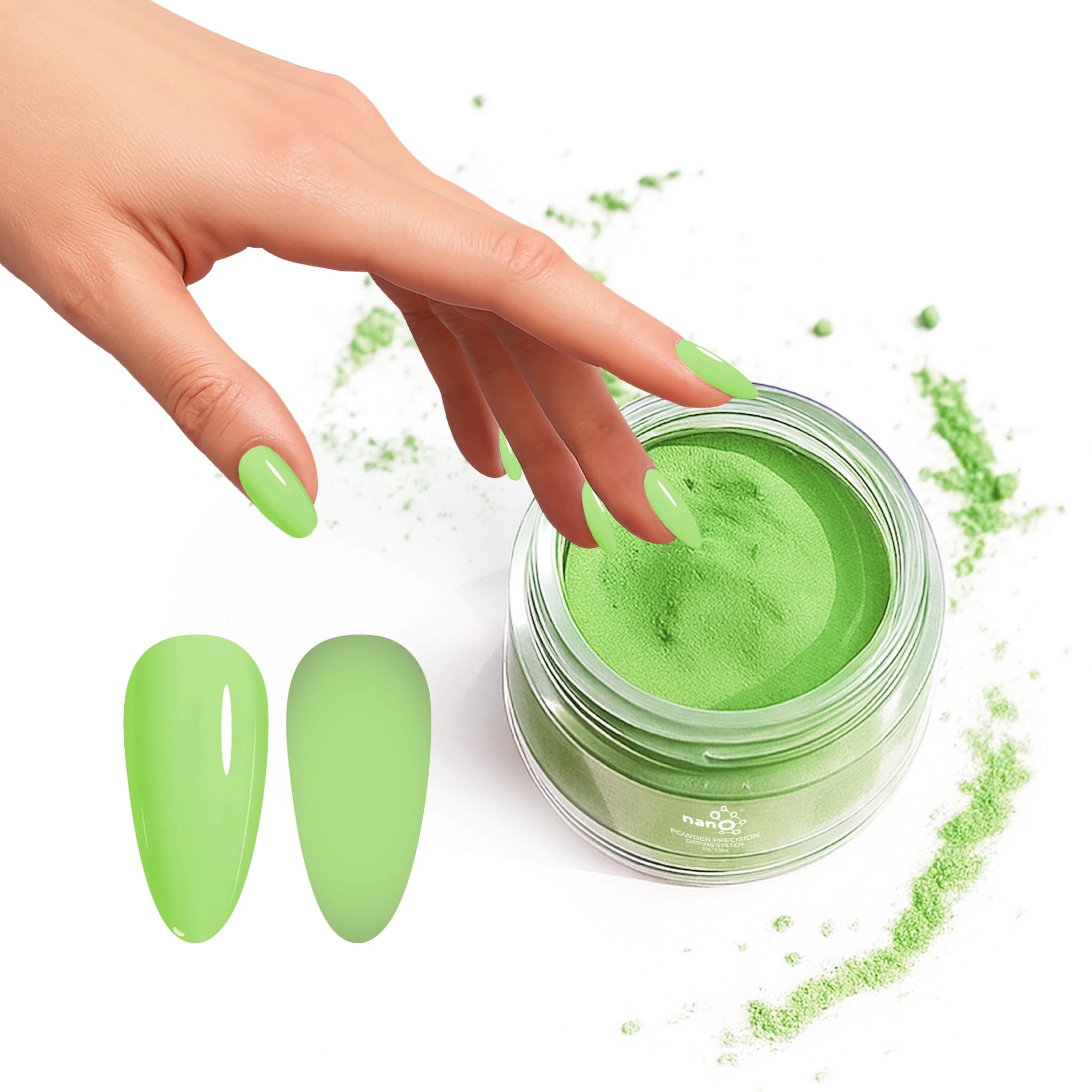 - أضيفي البودرة: اغمسي أظافرك فورًا في بودرة Nano® Dip Powder أو رشي البودرة بالتساوي على الأظافر. قومي بإزالة أي بودرة زائدة برفق.
