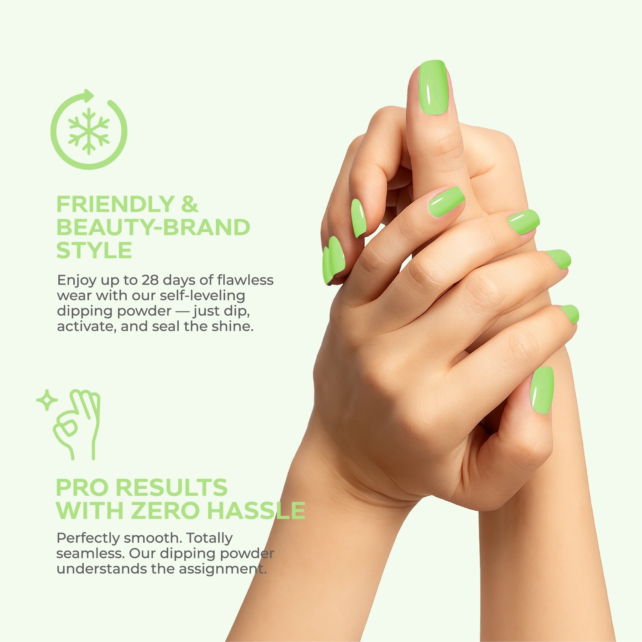 • احصلي على لمسة نهائية بجودة الصالون باستخدام نظام مسحوق الغمس البسيط وسهل الاستخدام.