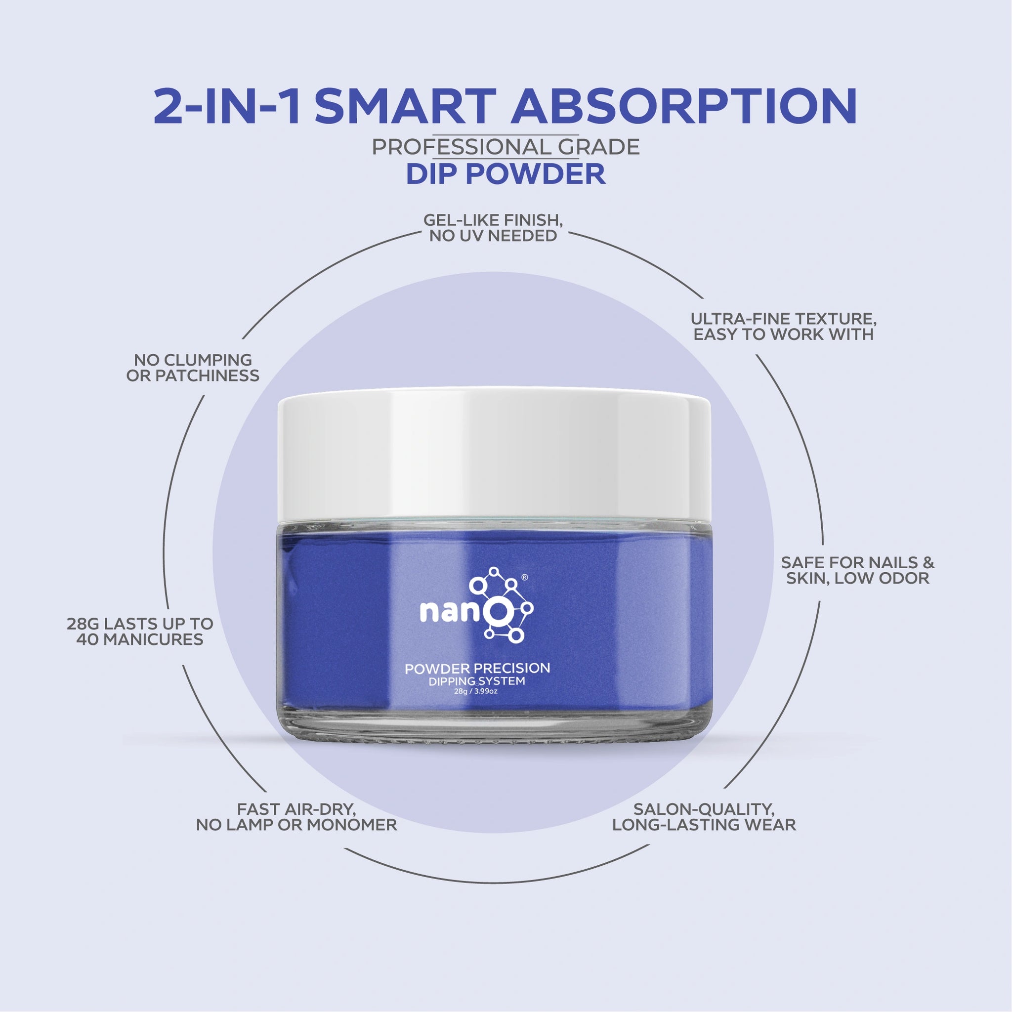 - أضيفي البودرة: اغمسي أظافرك فورًا في بودرة Nano® Dip Powder أو رشي البودرة بالتساوي على الأظافر. قومي بإزالة أي بودرة زائدة برفق.