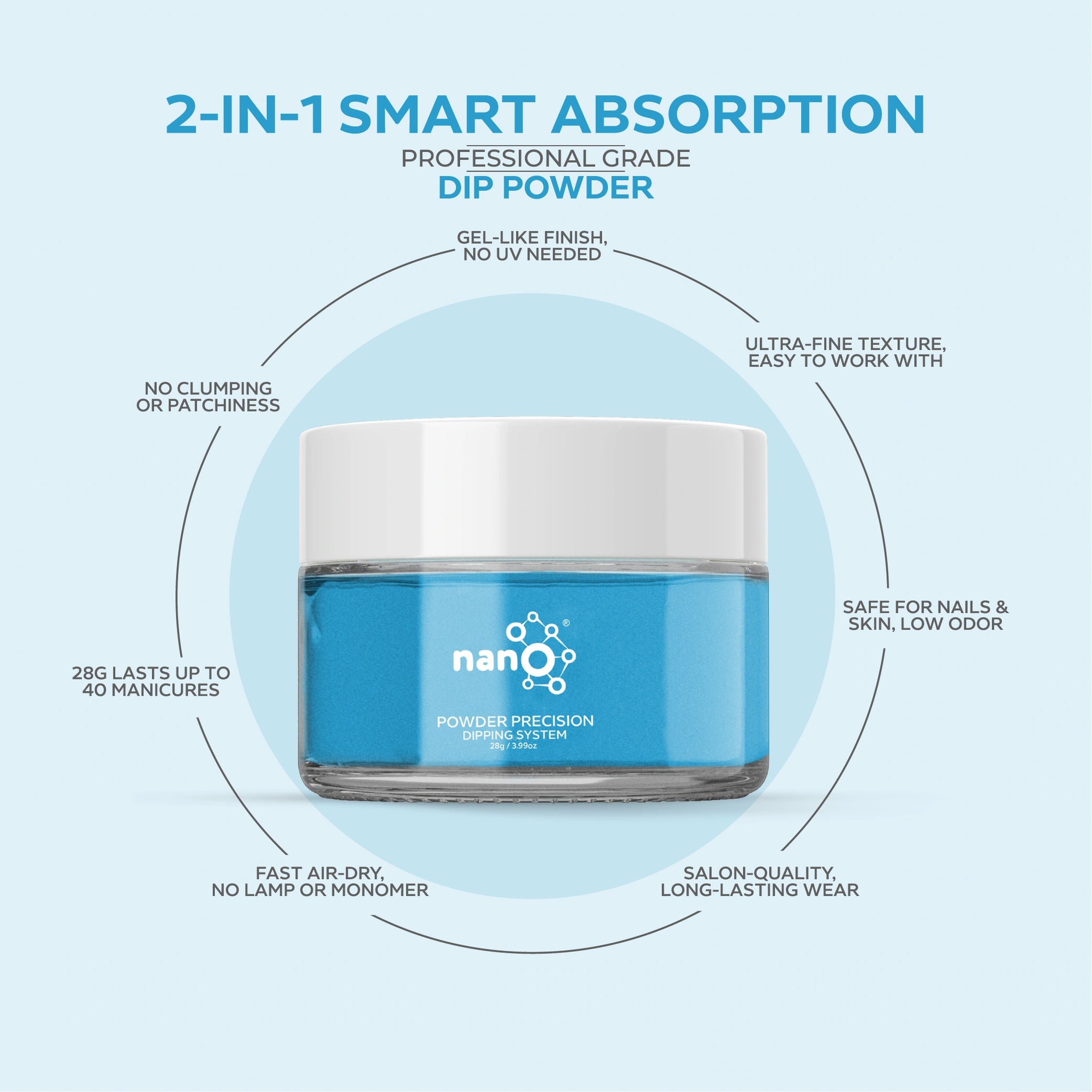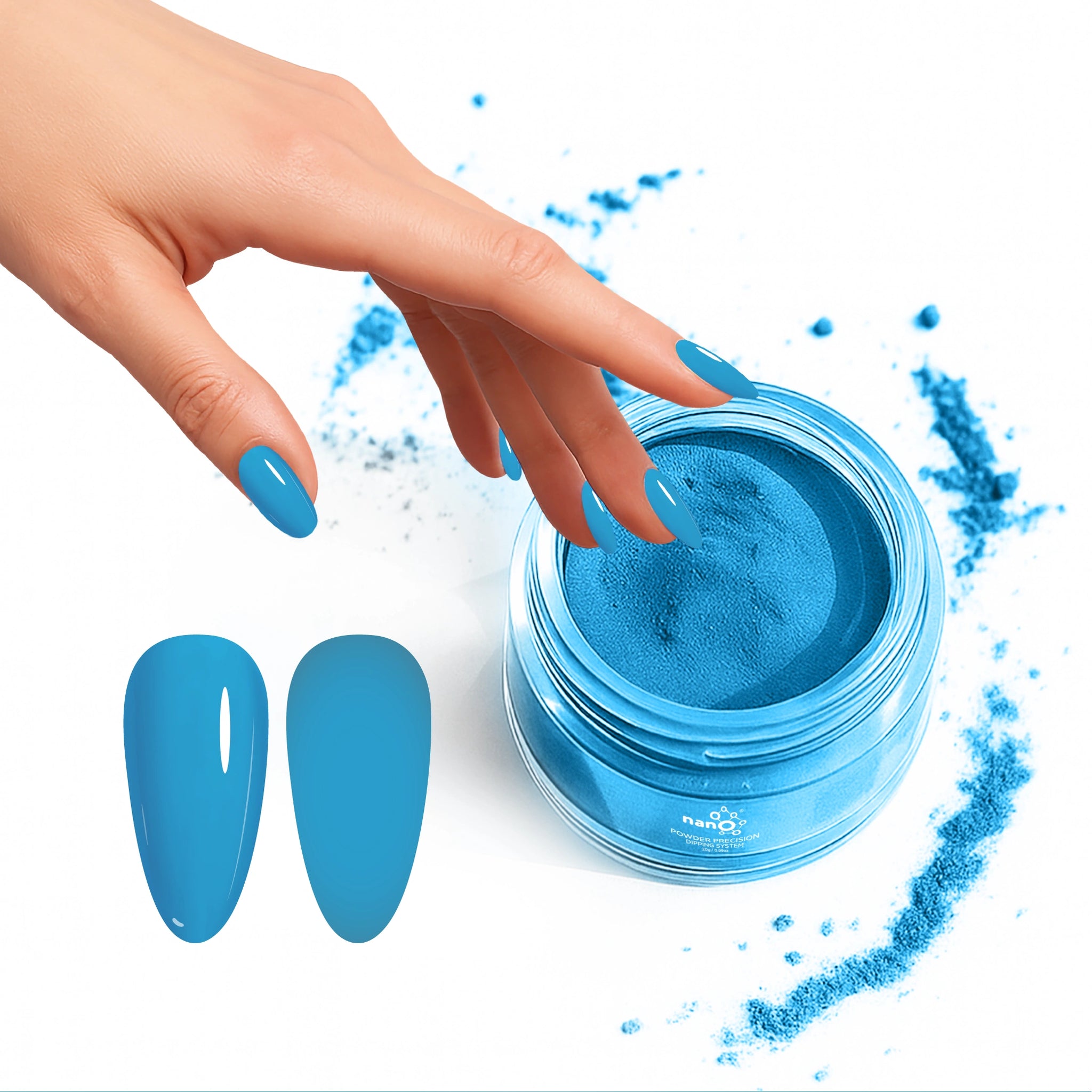 - أضيفي البودرة: اغمسي أظافرك فورًا في بودرة Nano® Dip Powder أو رشي البودرة بالتساوي على الأظافر. قومي بإزالة أي بودرة زائدة برفق.