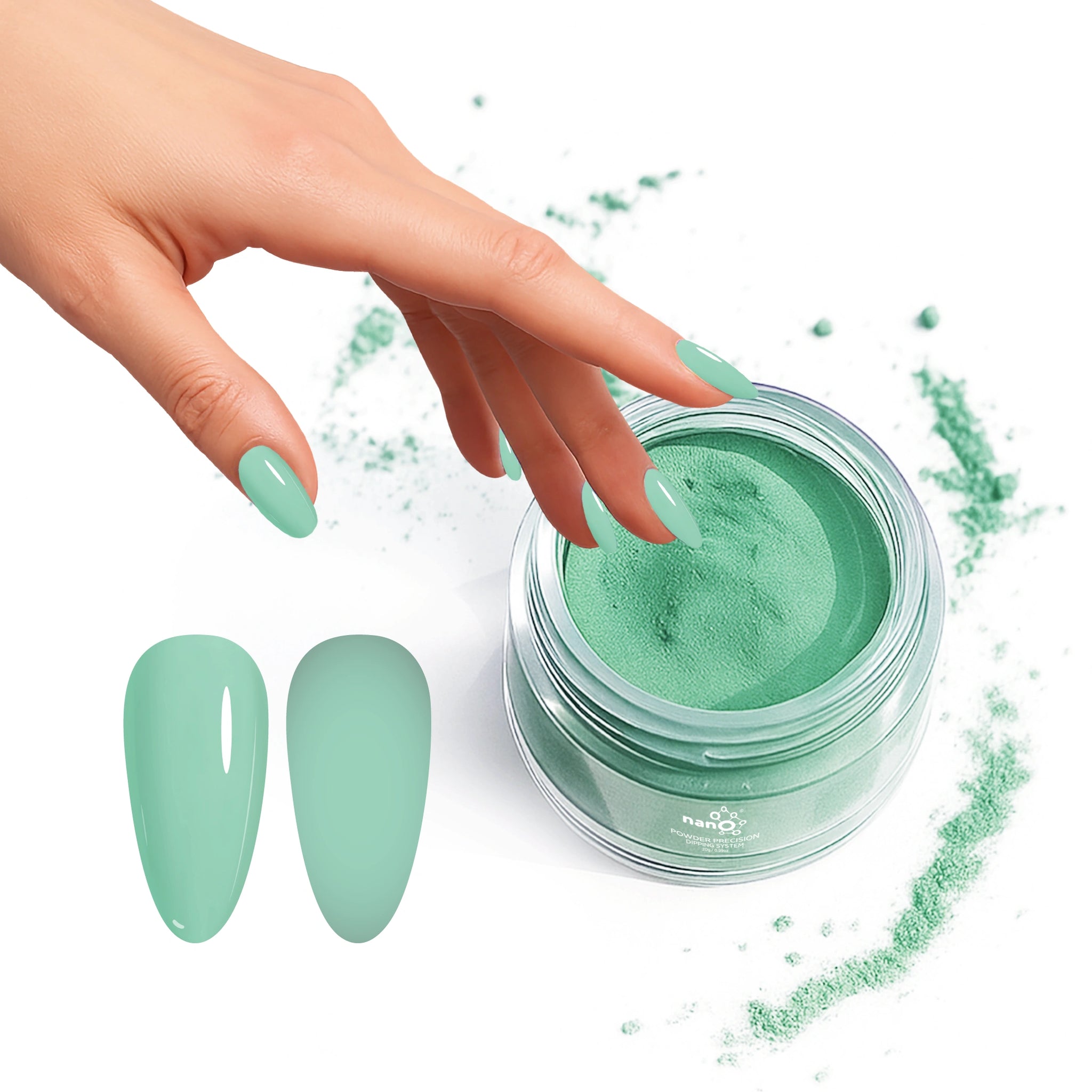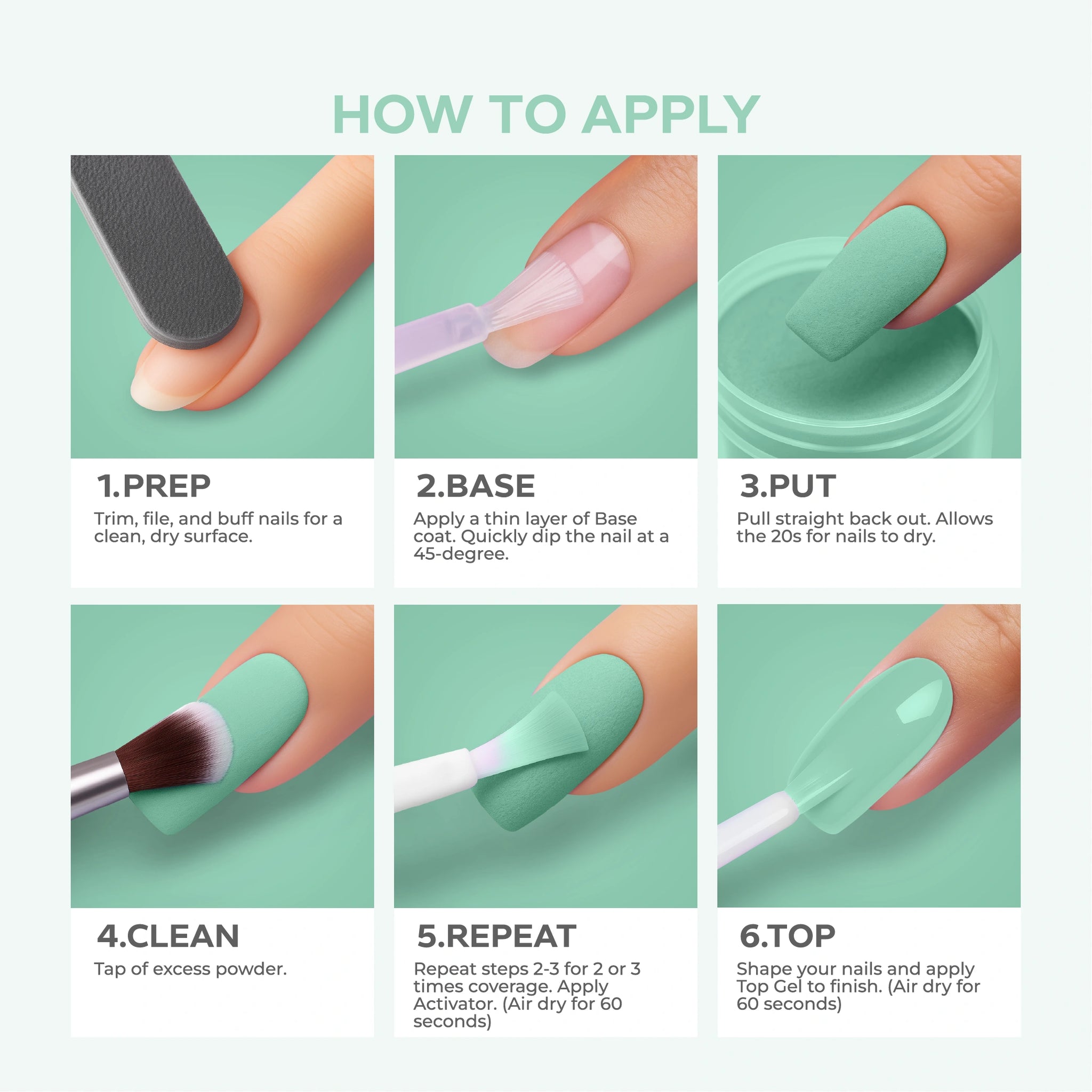 - أضيفي البودرة: اغمسي أظافرك فورًا في بودرة Nano® Dip Powder أو رشي البودرة بالتساوي على الأظافر. قومي بإزالة أي بودرة زائدة برفق.