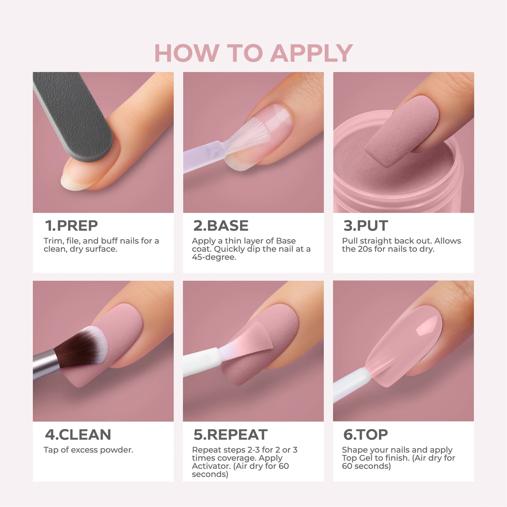 - أضيفي البودرة: اغمسي أظافرك فورًا في بودرة Nano® Dip Powder أو رشي البودرة بالتساوي على الأظافر. قومي بإزالة أي بودرة زائدة برفق.