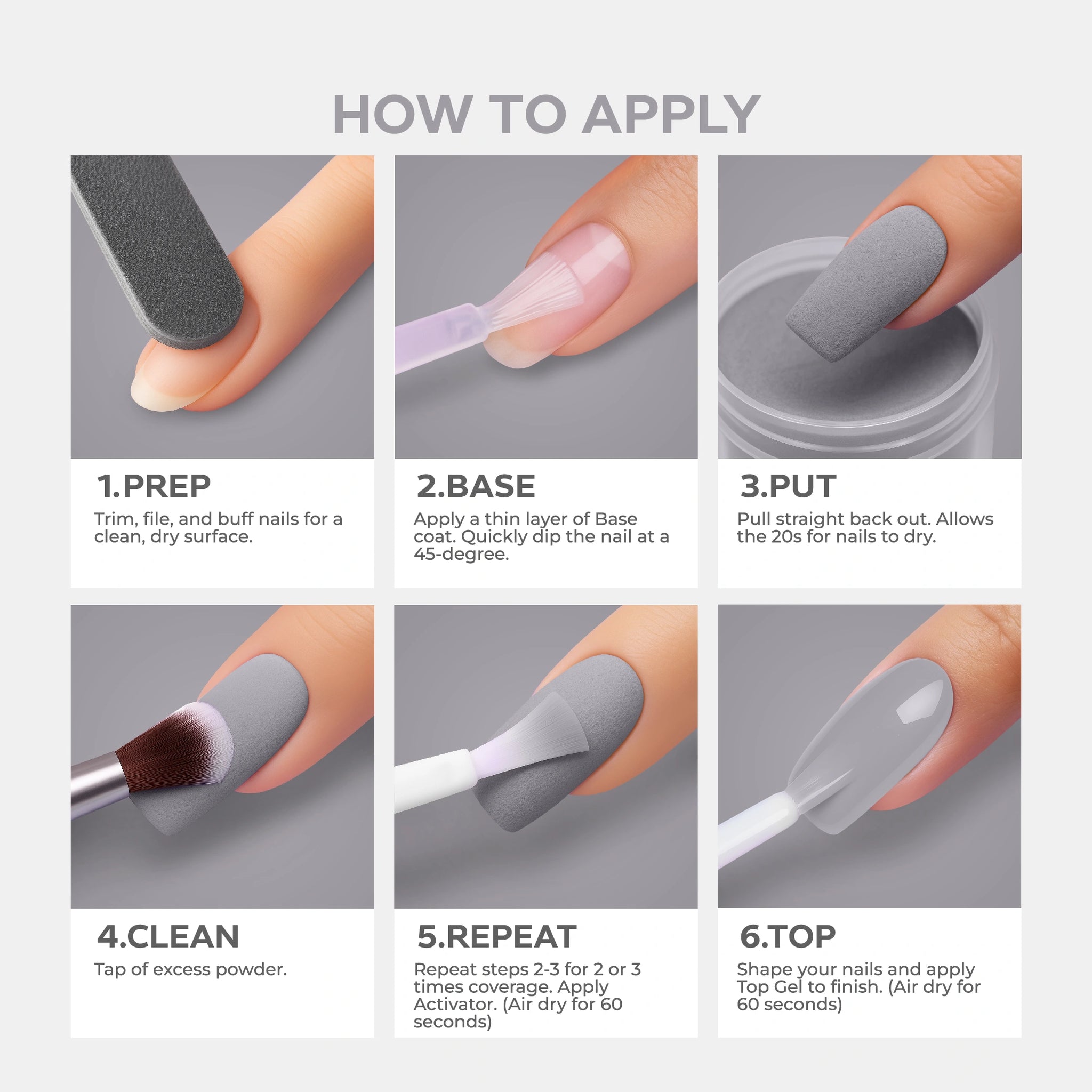 - أضيفي البودرة: اغمسي أظافرك فورًا في بودرة Nano® Dip Powder أو رشي البودرة بالتساوي على الأظافر. قومي بإزالة أي بودرة زائدة برفق.
