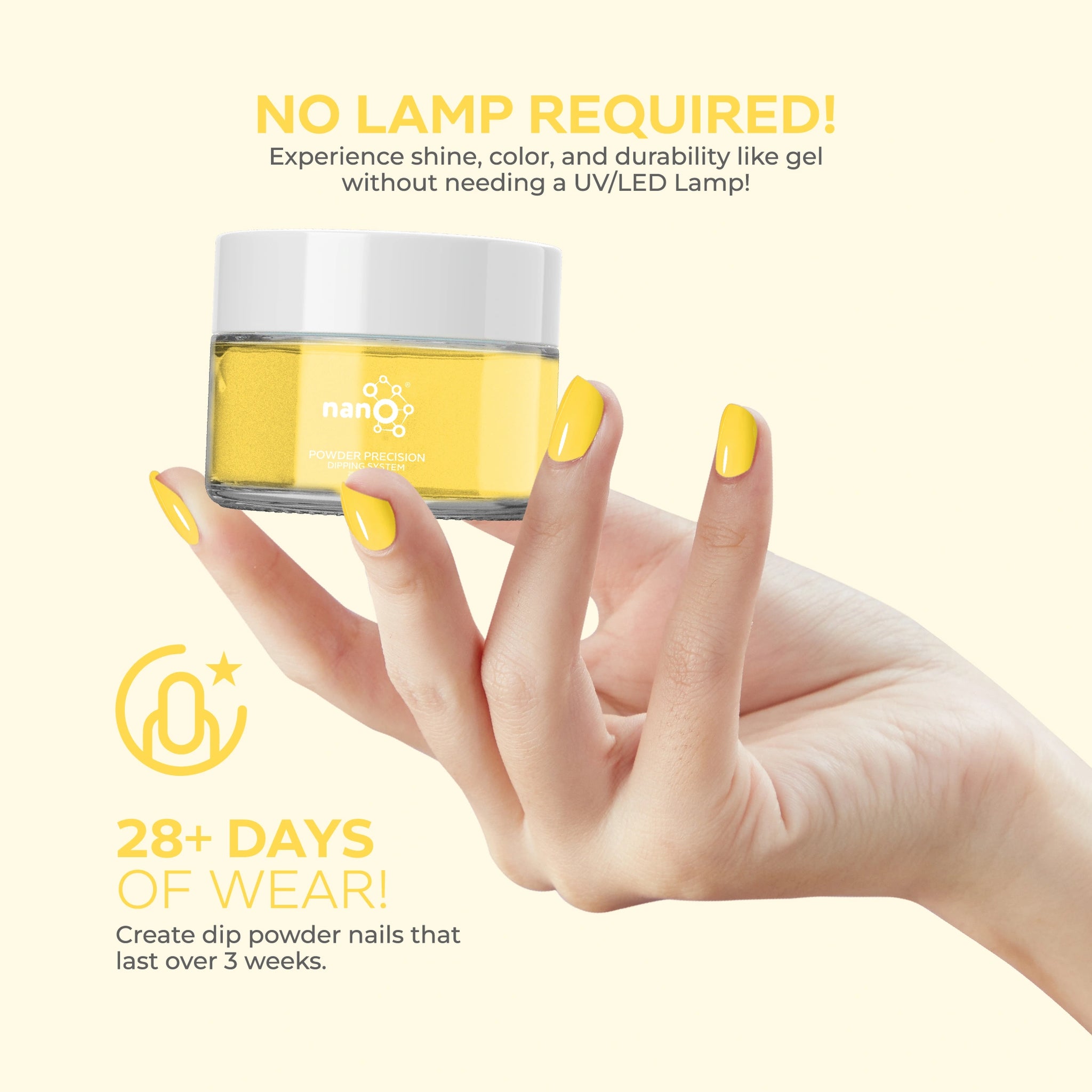 - أضيفي البودرة: اغمسي أظافرك فورًا في بودرة Nano® Dip Powder أو رشي البودرة بالتساوي على الأظافر. قومي بإزالة أي بودرة زائدة برفق.