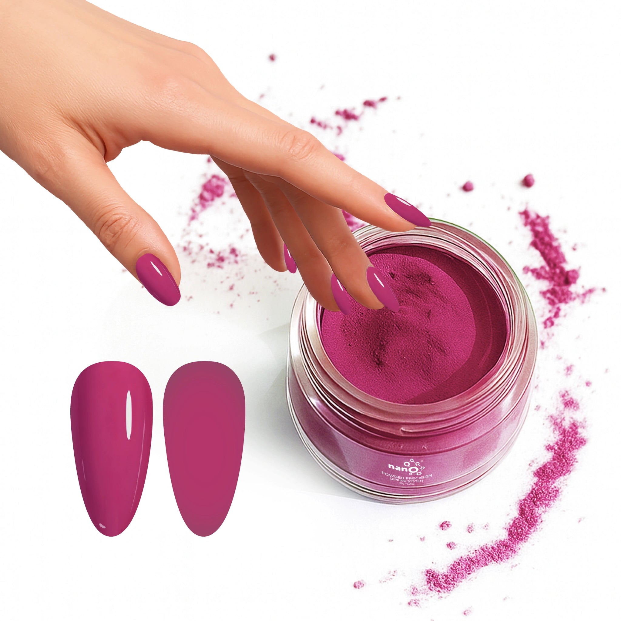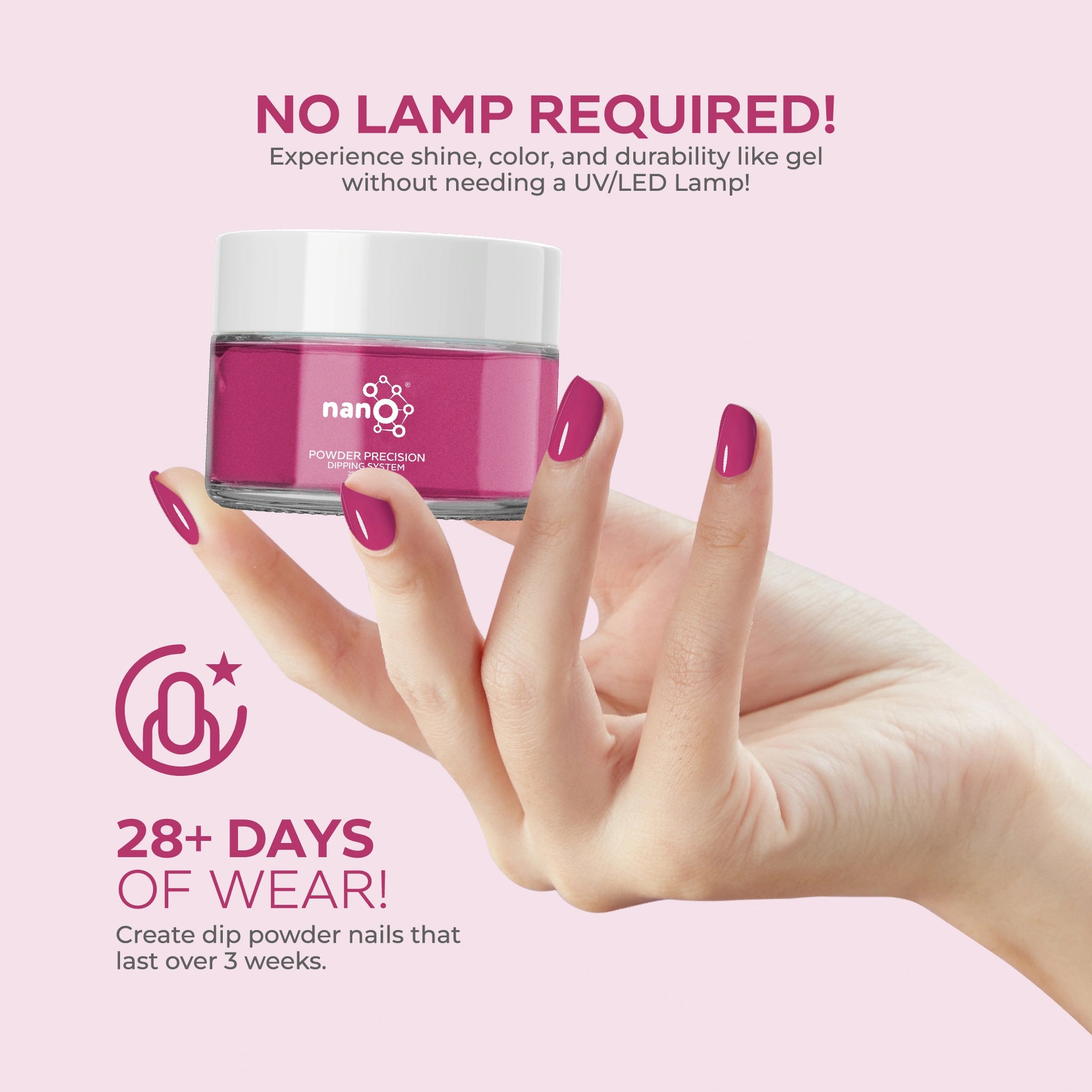 - أضيفي البودرة: اغمسي أظافرك فورًا في بودرة Nano® Dip Powder أو رشي البودرة بالتساوي على الأظافر. قومي بإزالة أي بودرة زائدة برفق.