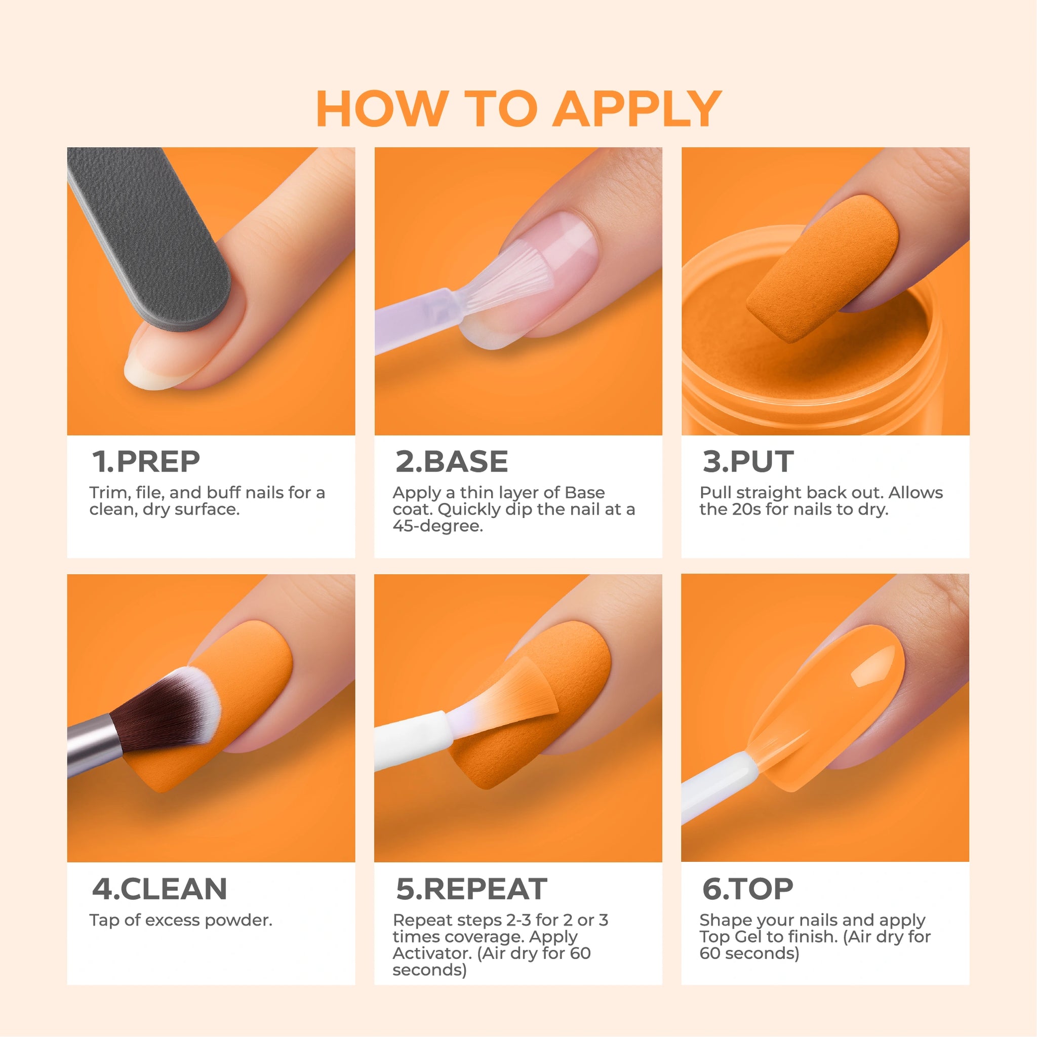 - أضيفي البودرة: اغمسي أظافرك فورًا في بودرة Nano® Dip Powder أو رشي البودرة بالتساوي على الأظافر. قومي بإزالة أي بودرة زائدة برفق.