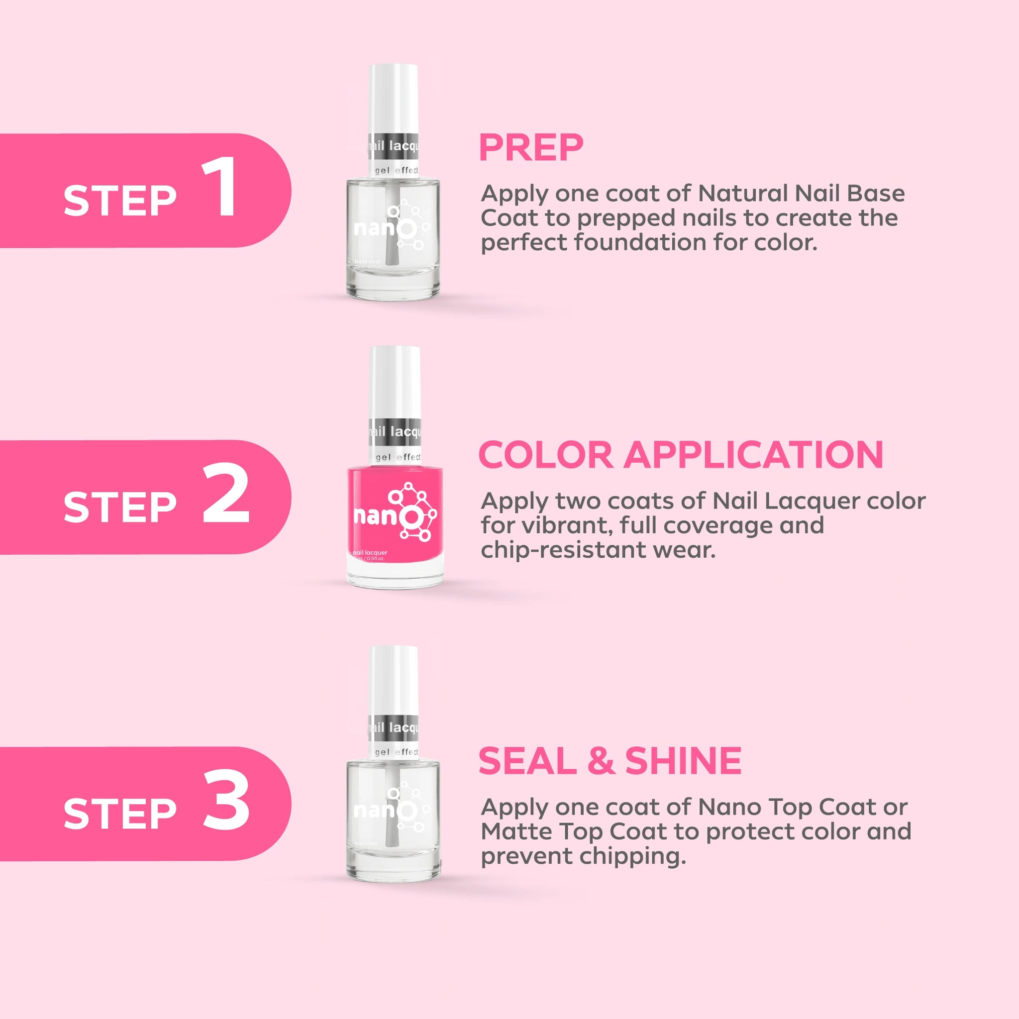 - ضعي طبقة القاعدة Nano® / Light Builder المفضلة لديك على الأظافر النظيفة وجففيها تحت مصباح Nano® Bright UV/LED لمدة 60 ثانية.