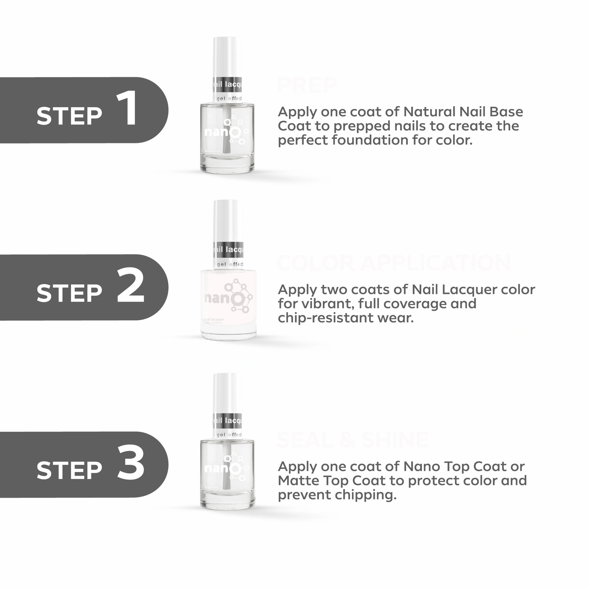 - قم بإنهاء العمل عن طريق تطبيق Nano® Normal Top Coat للحصول على لمسة نهائية لامعة تدوم طويلاً.