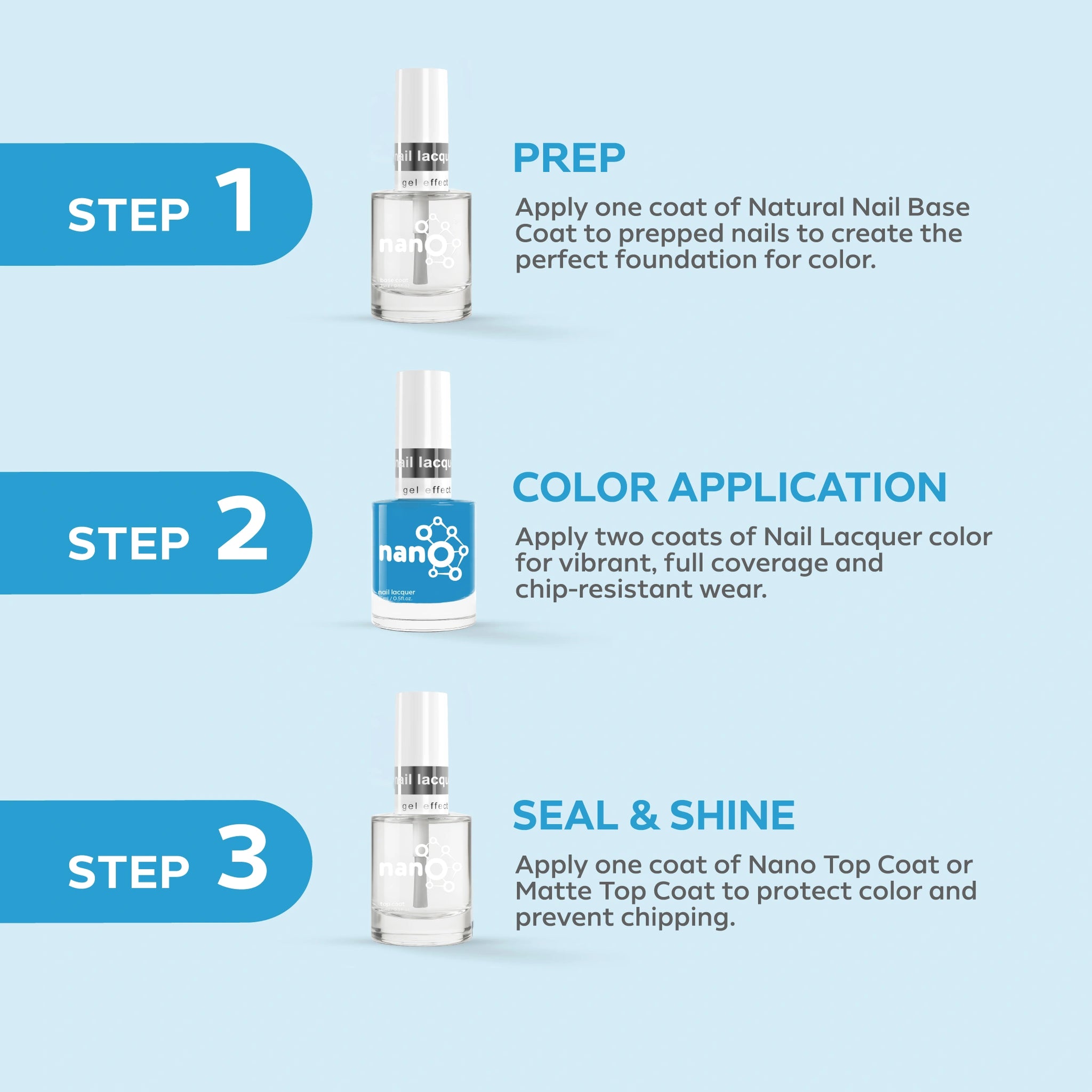 - ضعي طبقة القاعدة Nano® / Light Builder المفضلة لديك على الأظافر النظيفة وجففيها تحت مصباح Nano® Bright UV/LED لمدة 60 ثانية.