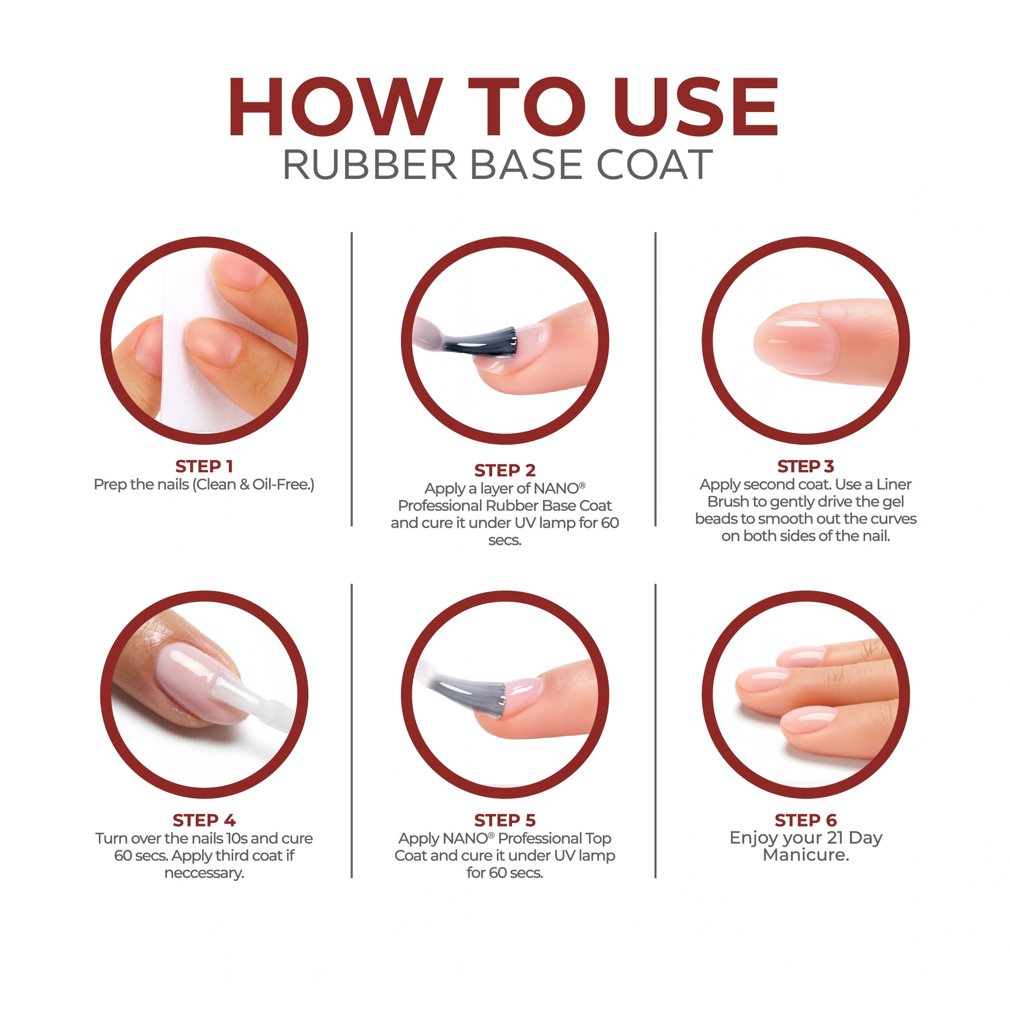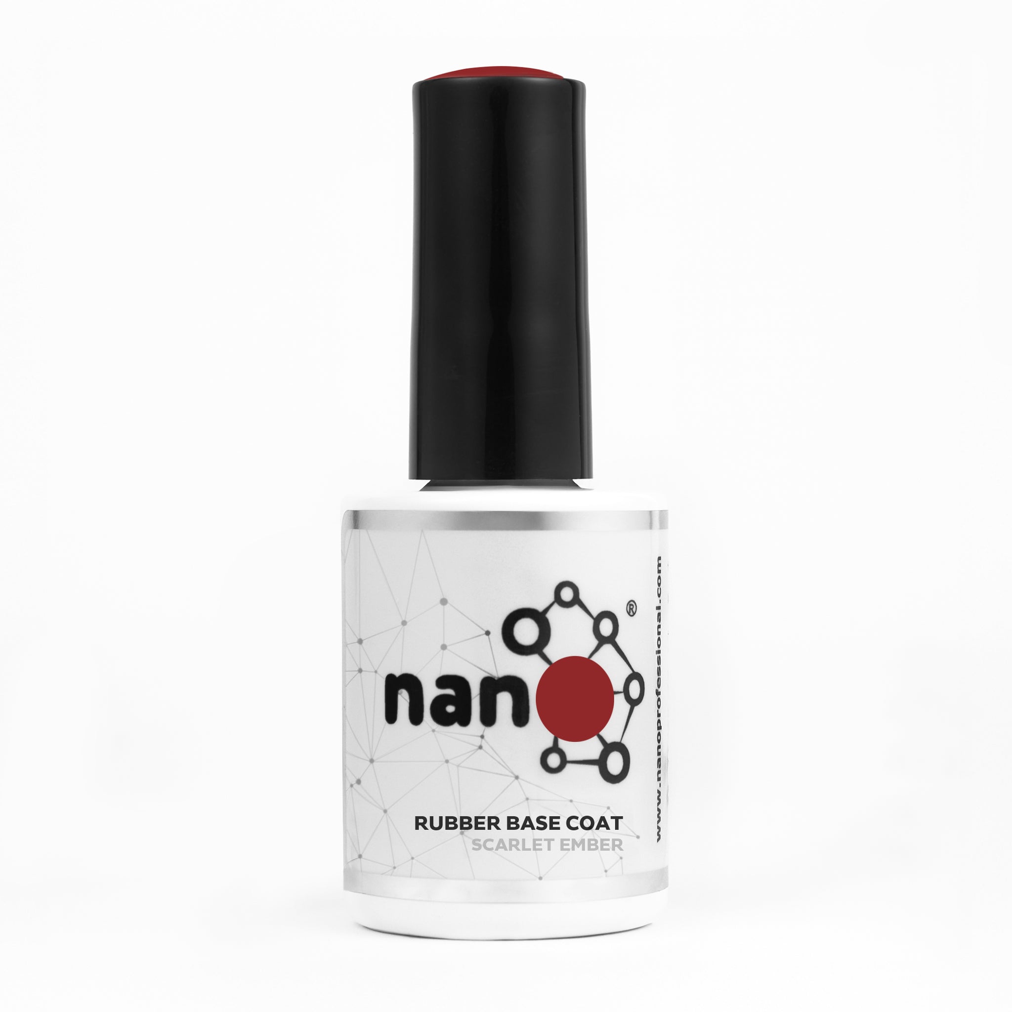 - ثم ضعي طبقة رقيقة من طلاء القاعدة المطاطي Nano® (بناء، متوسط أو خفيف حسب اختيارك) على الأظافر المحضرة.