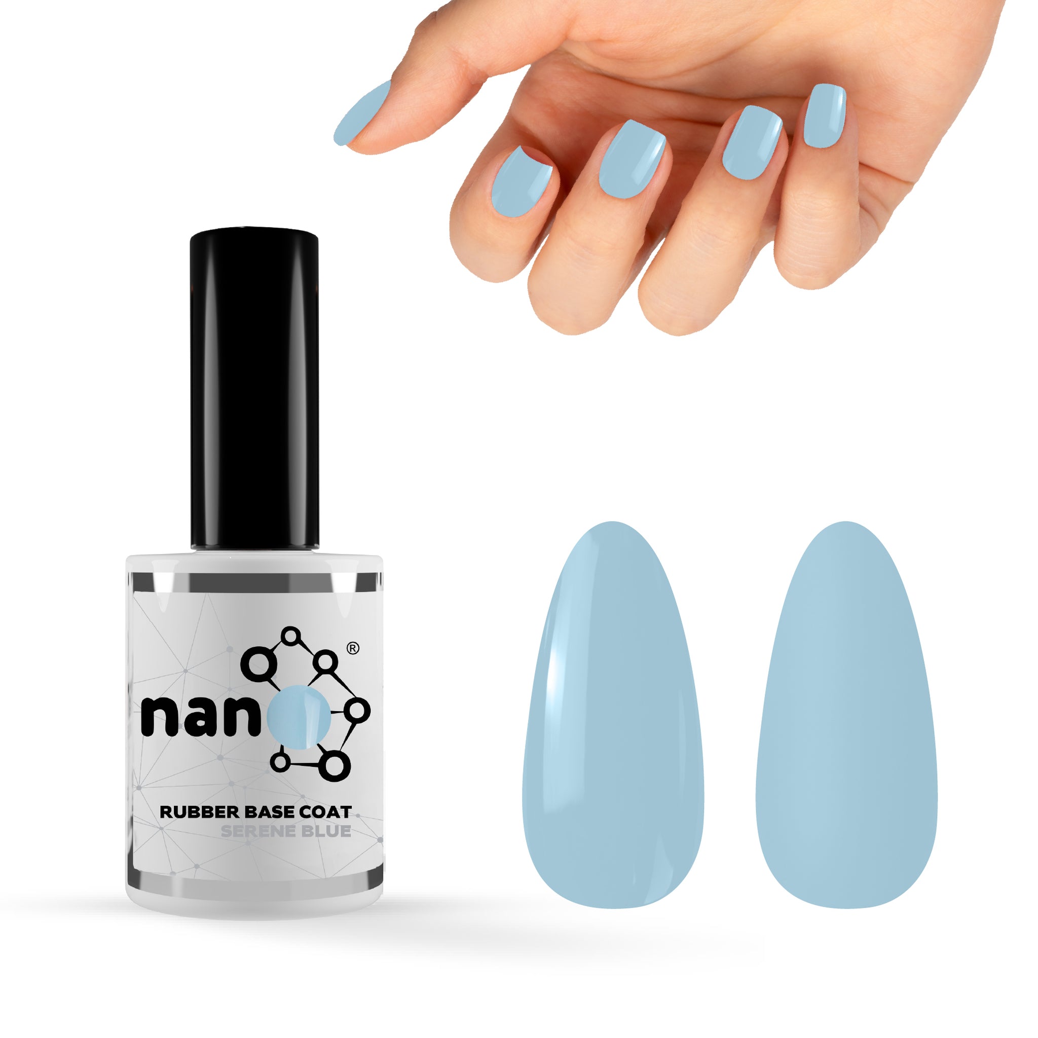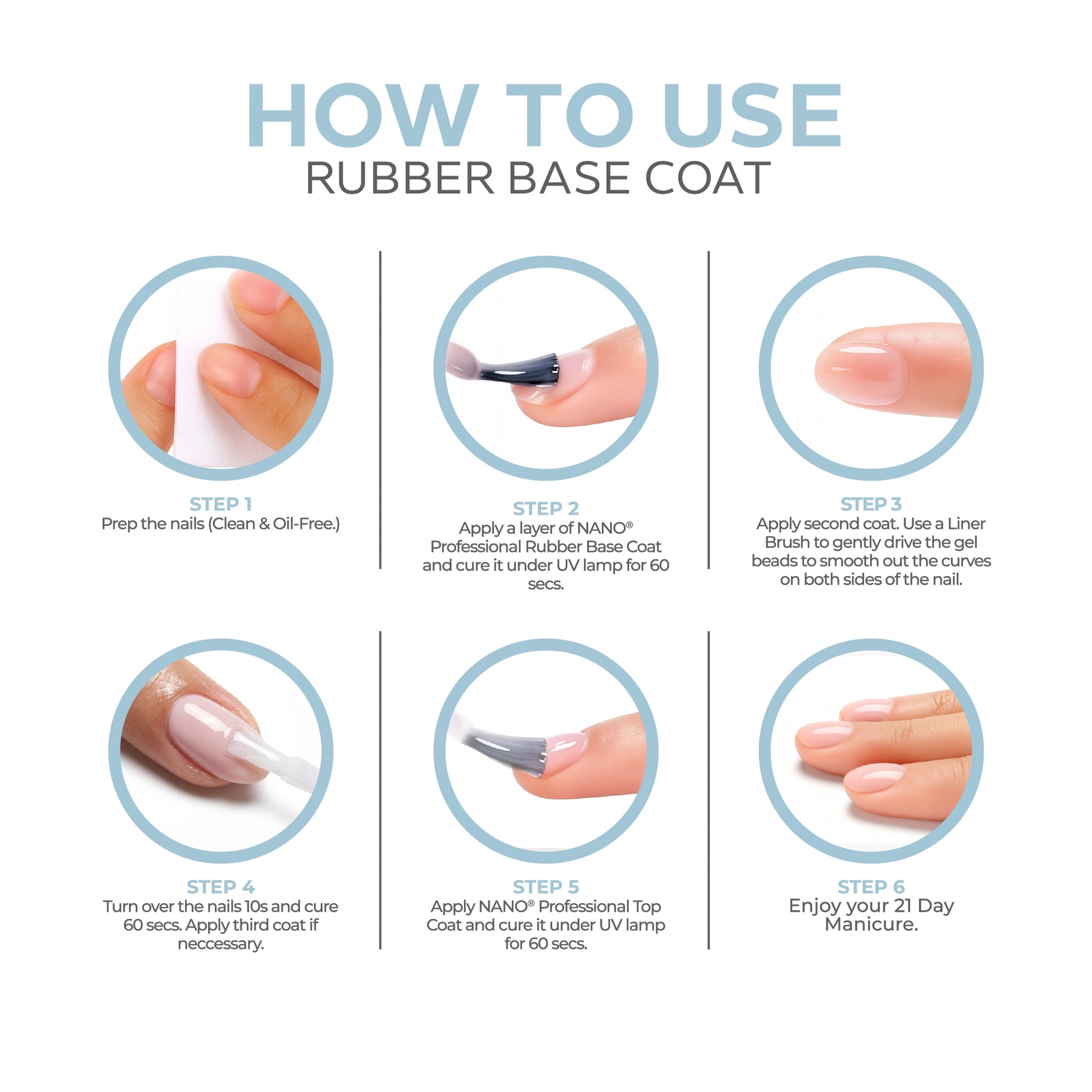 - ثم ضعي طبقة رقيقة من طلاء القاعدة المطاطي Nano® (بناء، متوسط أو خفيف حسب اختيارك) على الأظافر المحضرة.