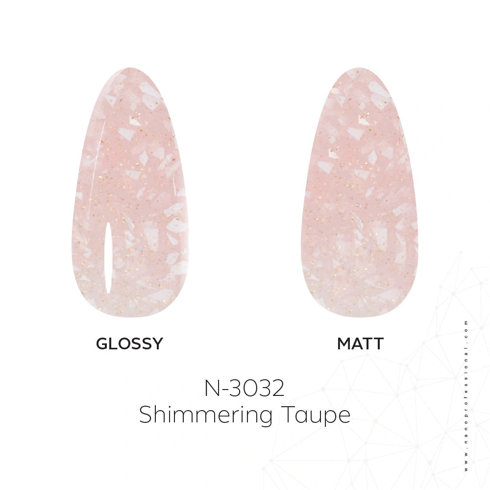 مستوحى من التوهج الطبيعي للبشرة المتألقة، يعد اللون البني المتلألئ مثاليًا لإضافة لمسة من الدفء والضوء إلى أي مانيكير. يخلق التفاعل بين اللون الوردي والبقع المعدنية تأثيرًا جذابًا، مما يجعله خيارًا مثاليًا للارتداء اليومي والمناسبات الخاصة.
