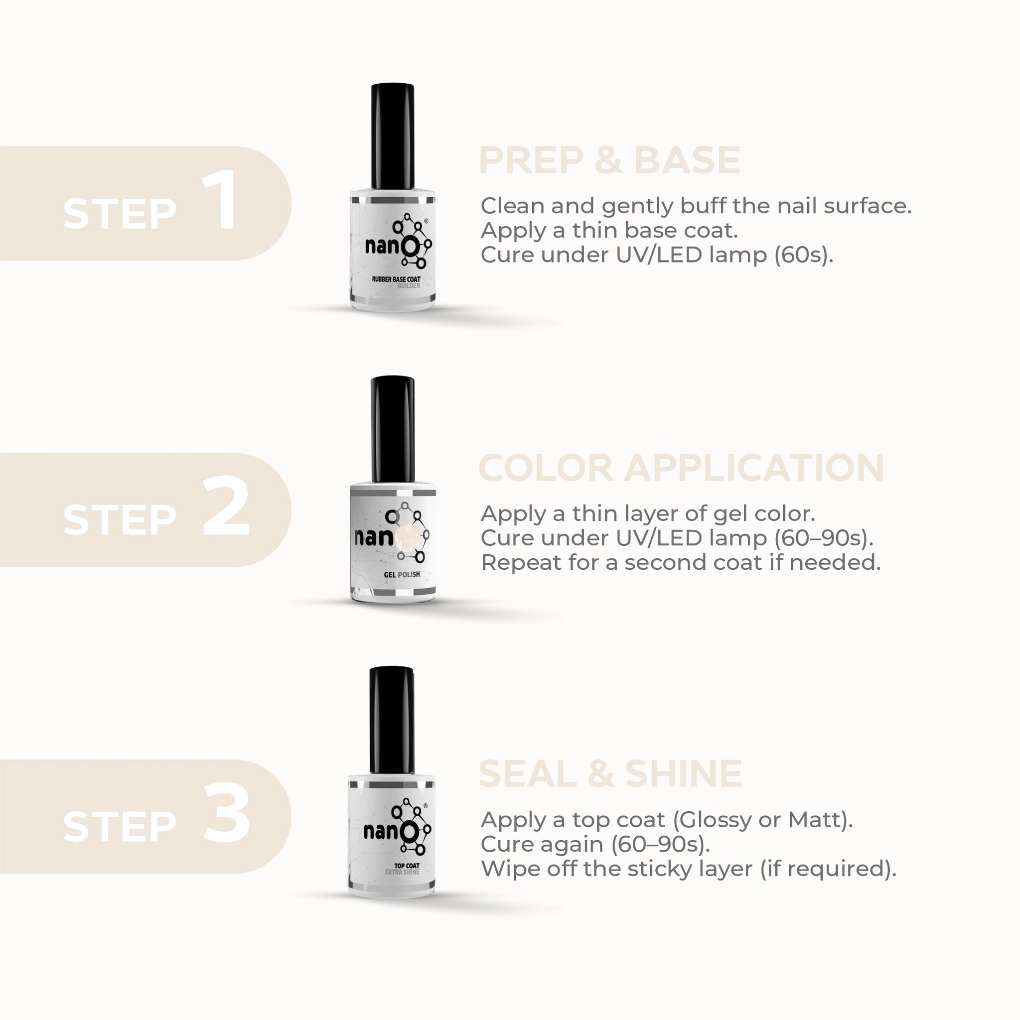 - ضعي طبقة القاعدة Nano® / Light Builder المفضلة لديك على الأظافر النظيفة وجففيها تحت مصباح Nano® Bright UV/LED لمدة 60 ثانية.