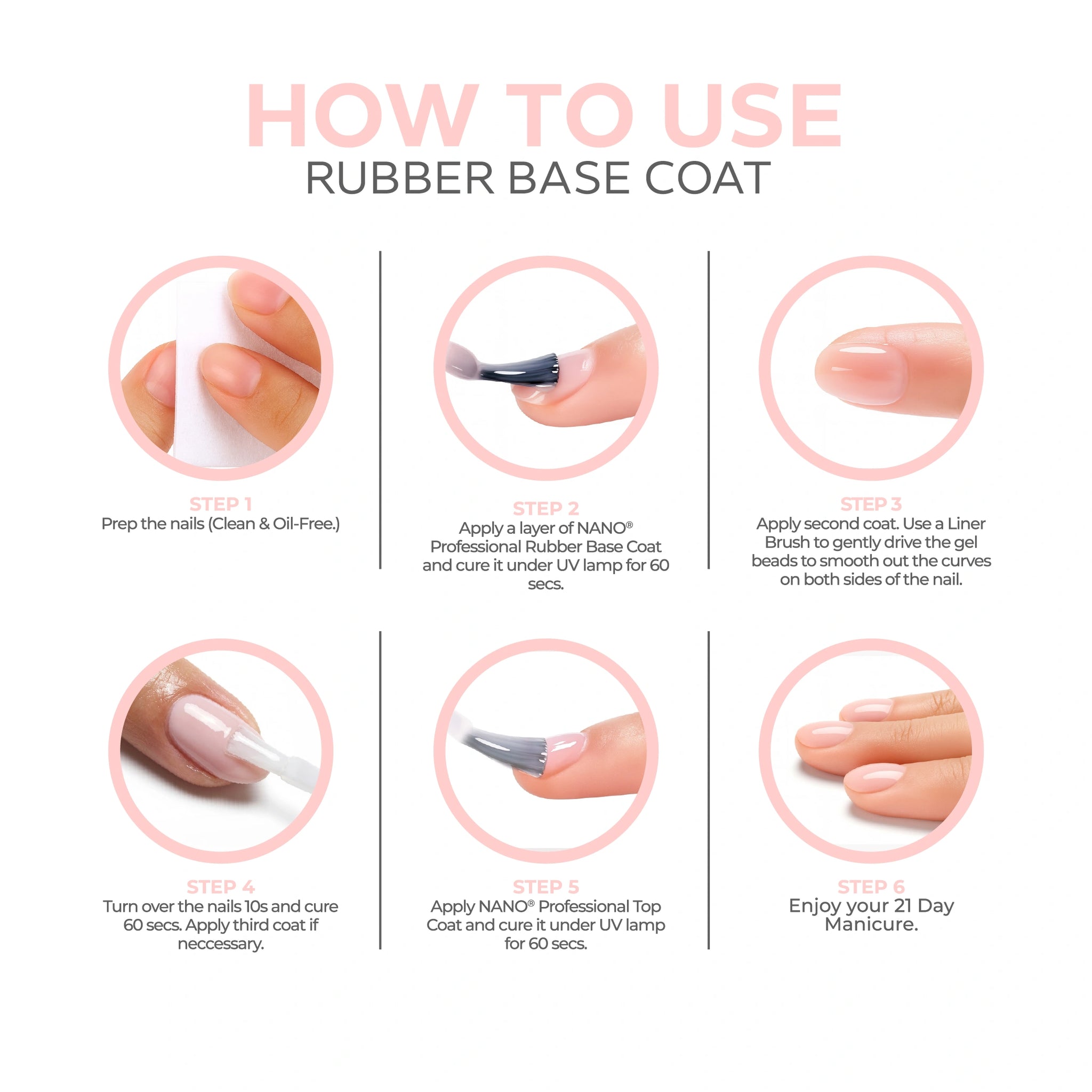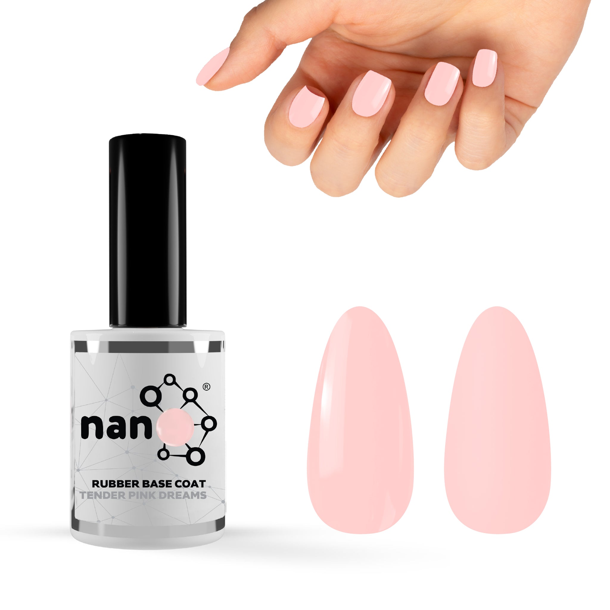- ثم ضعي طبقة رقيقة من طلاء القاعدة المطاطي Nano® (بناء، متوسط أو خفيف حسب اختيارك) على الأظافر المحضرة.