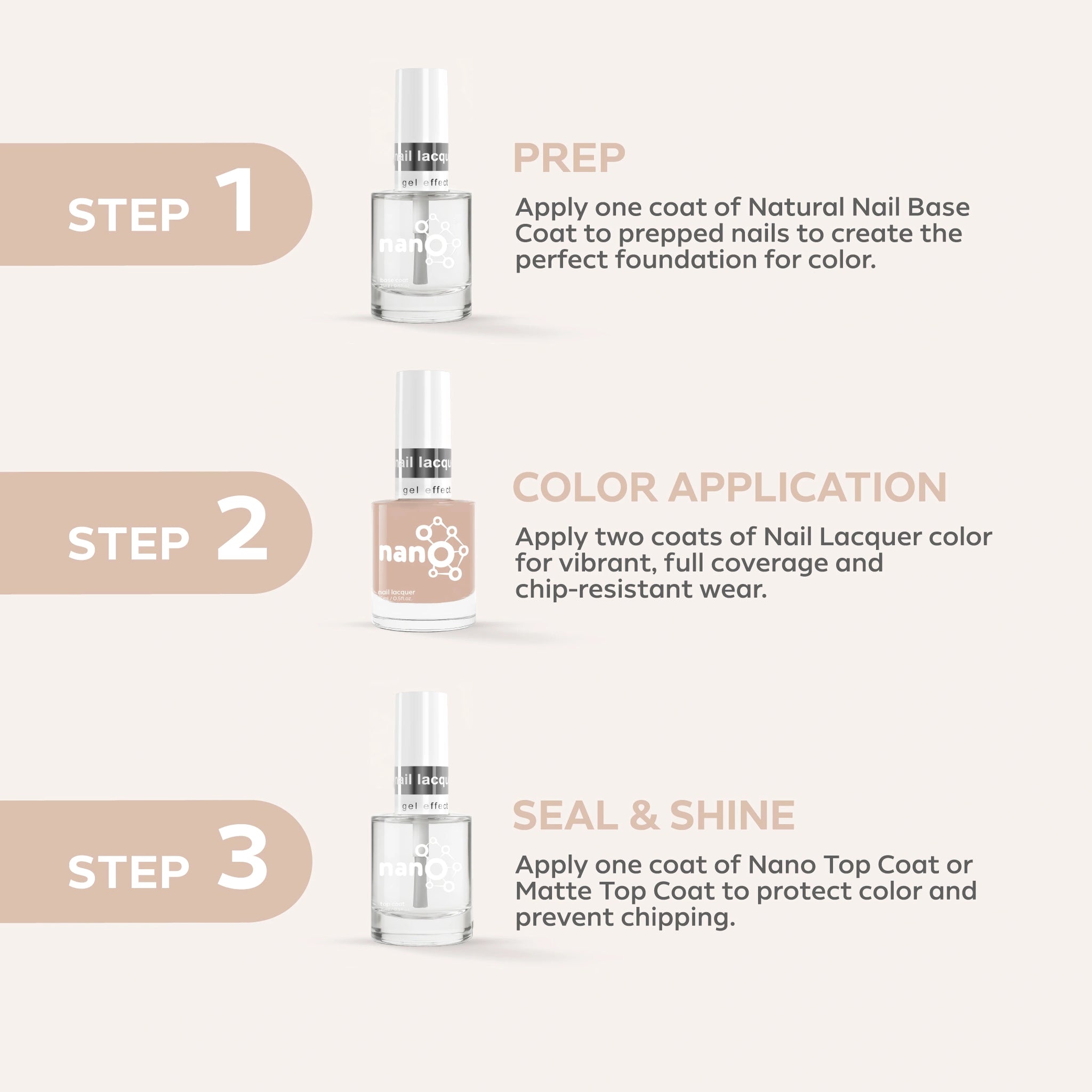 - ضعي طبقة القاعدة Nano® / Light Builder المفضلة لديك على الأظافر النظيفة وجففيها تحت مصباح Nano® Bright UV/LED لمدة 60 ثانية.
