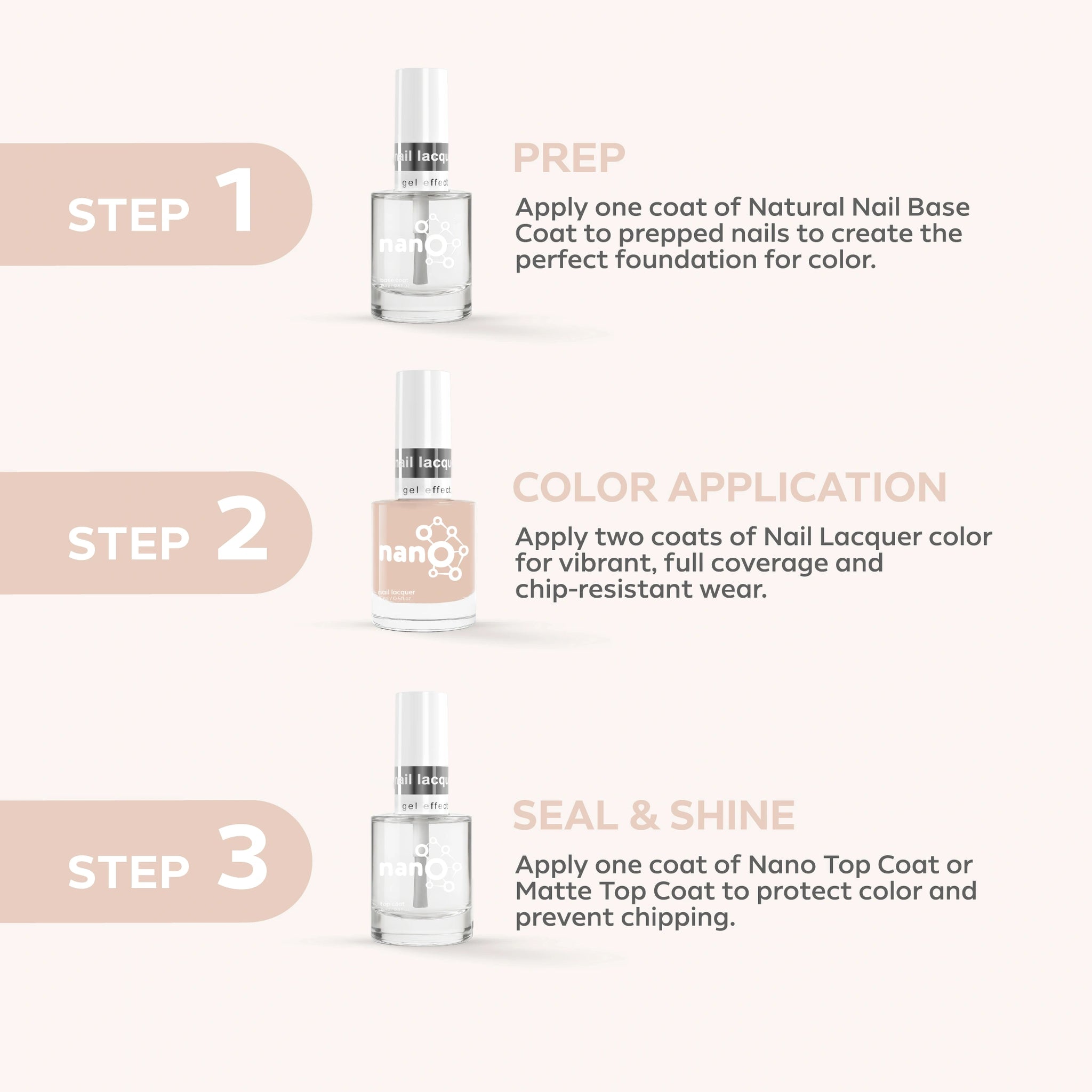- ضعي طبقة من Nano® Normal Base Coat لحماية أظافرك الطبيعية وضمان التصاق أفضل.