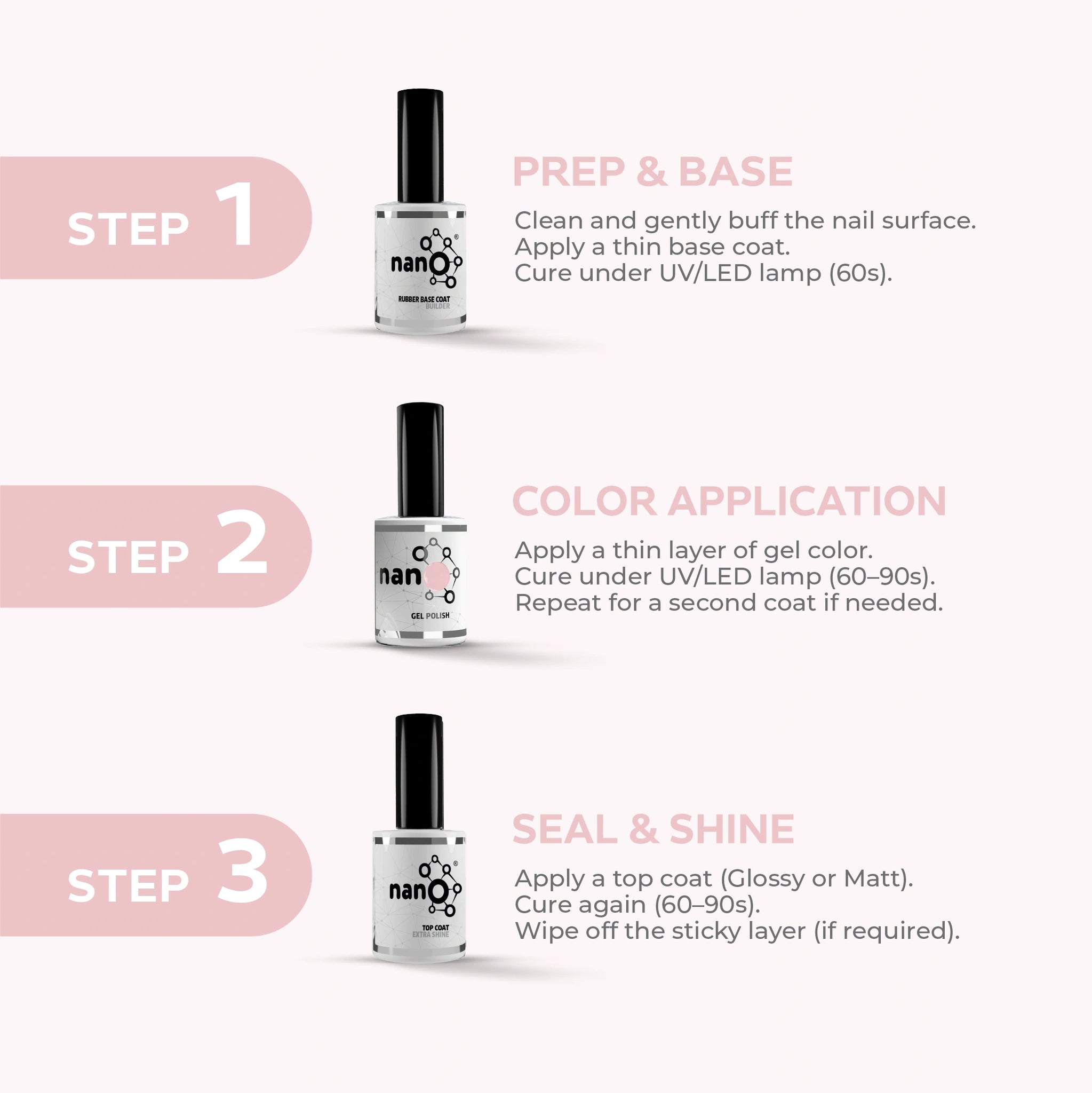 - Apply the first layer of Nano gel nail polish over the base coat and cure it for 60 seconds under a UV/LED lamp.