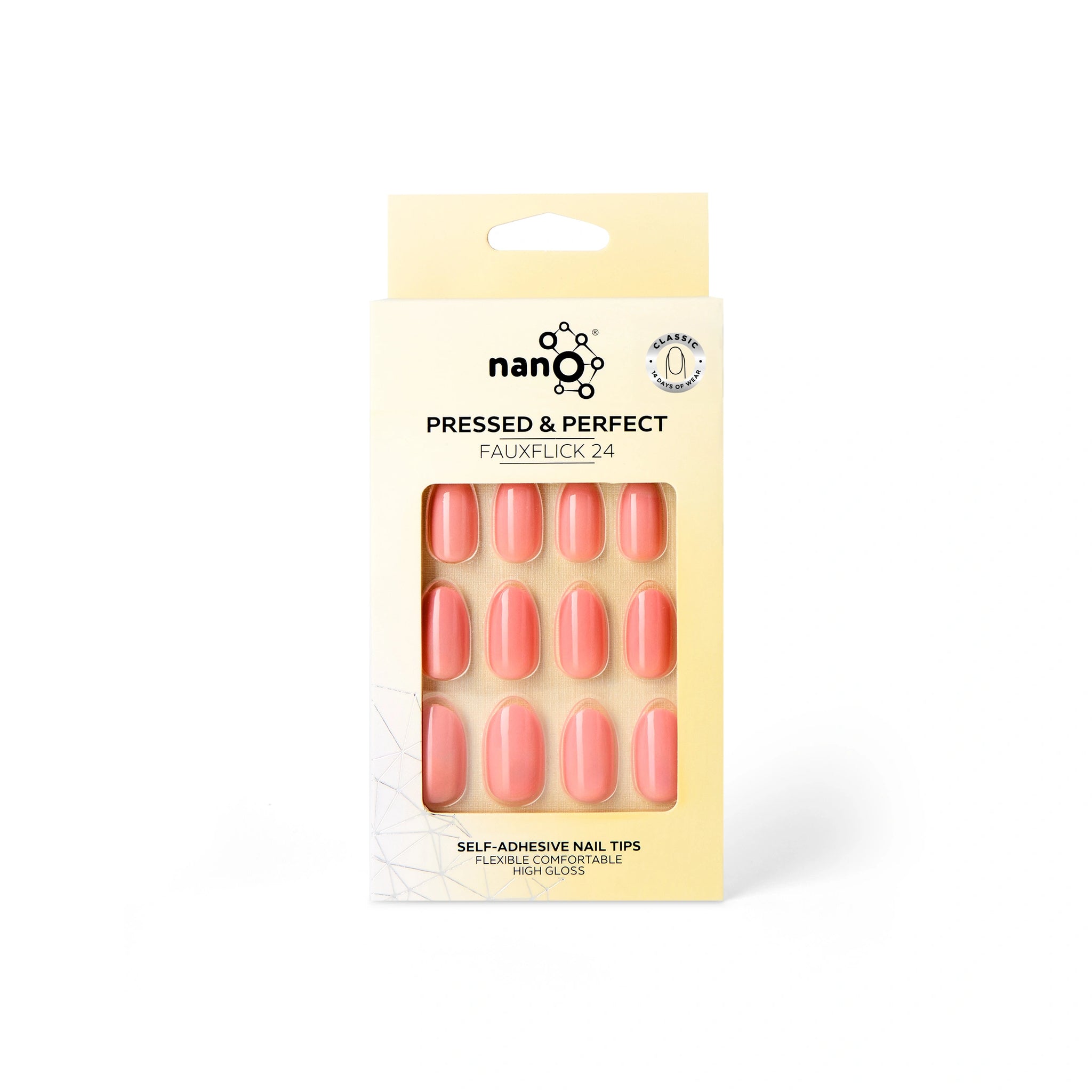 Nano® Blush Babe Pressed on Nails - 24pcs Self-Adhesive | Soft Coral Pink Finish, Glossy Natural Fake Nails Set
