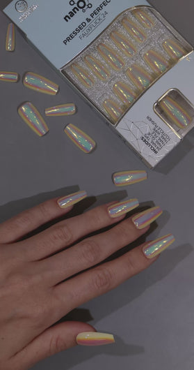 Nano® Chrome Golden Ember Pressed on Nails - 24pcs with Glue | Instant Gel-Like Shine, Gold Chrome Glossy Fake Nails Set