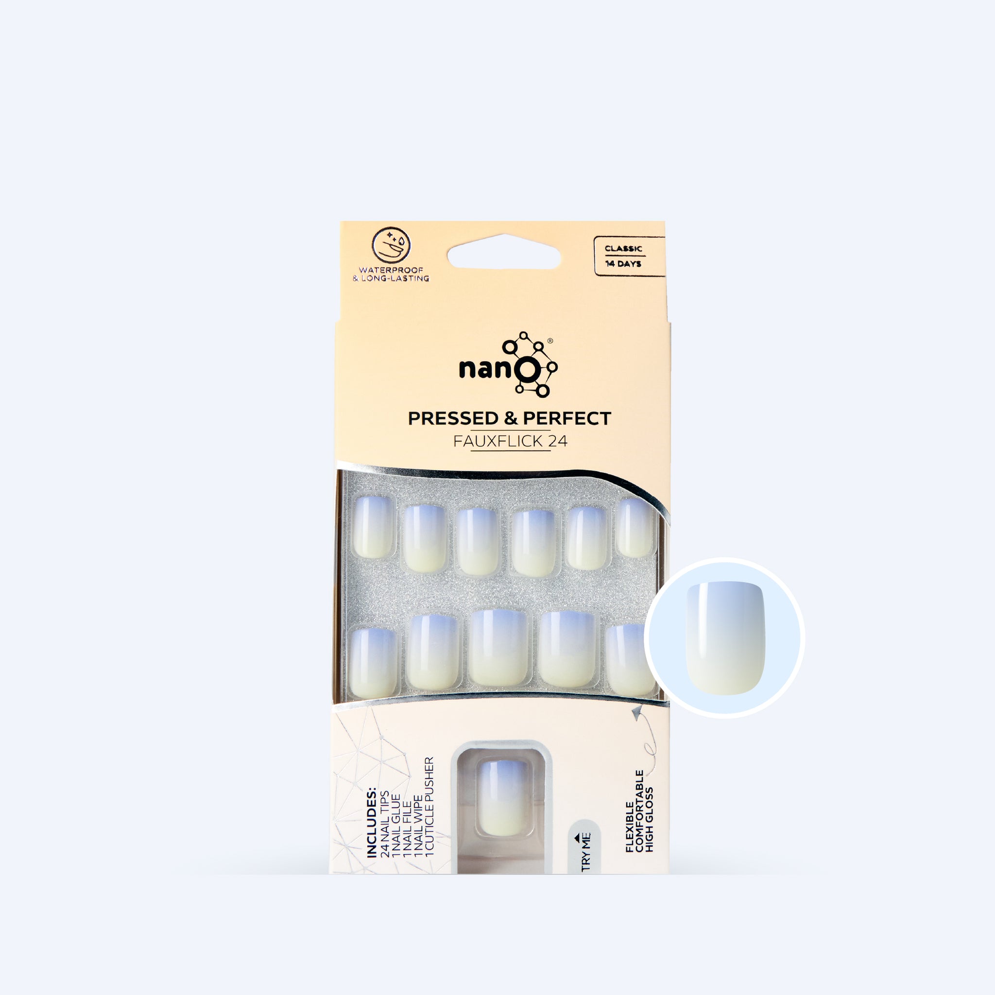 Nano® Cloud Whisper Pressed on Nails - 24pcs with Glue | Instant Gel-Like Shine, Soft Blue-White Ombre Fake Nails Set