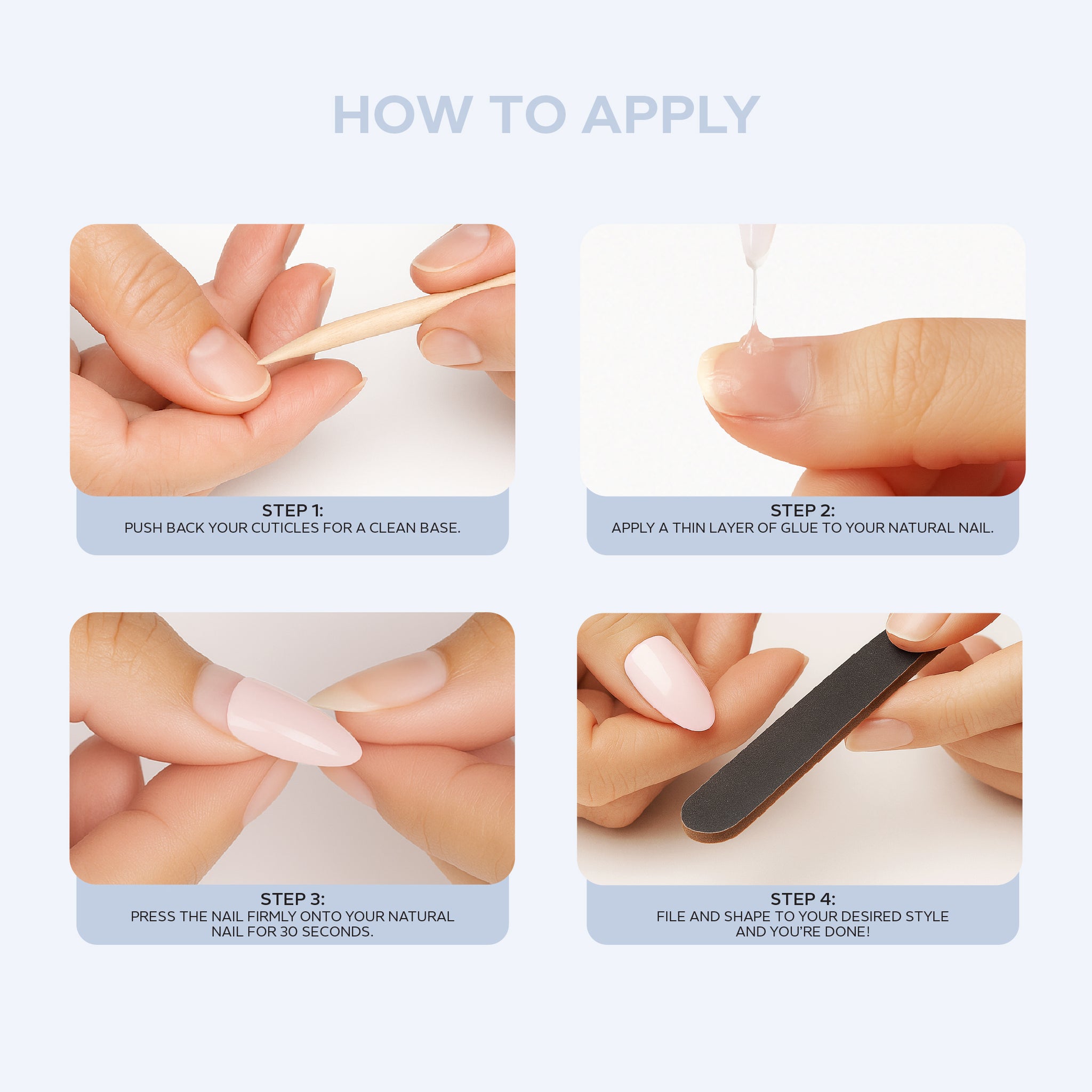 7. Complete Manicure Kit: Includes 24 nails, nail glue, prep wipe, and cuticle pusher — everything for a perfect at-home manicure.
