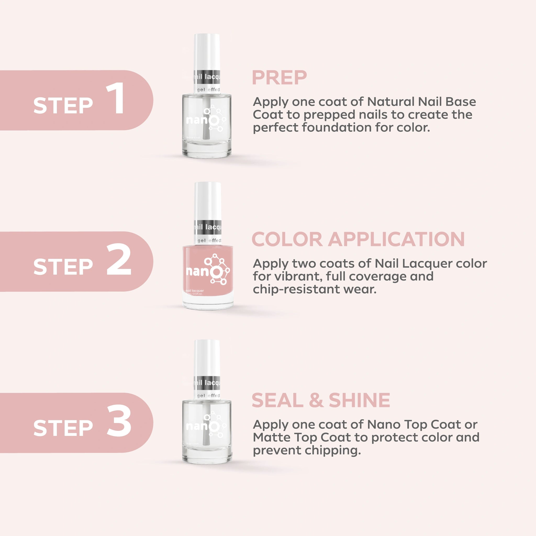 - Finish by applying Nano® Normal Top Coat for a long-lasting, high-gloss finish.